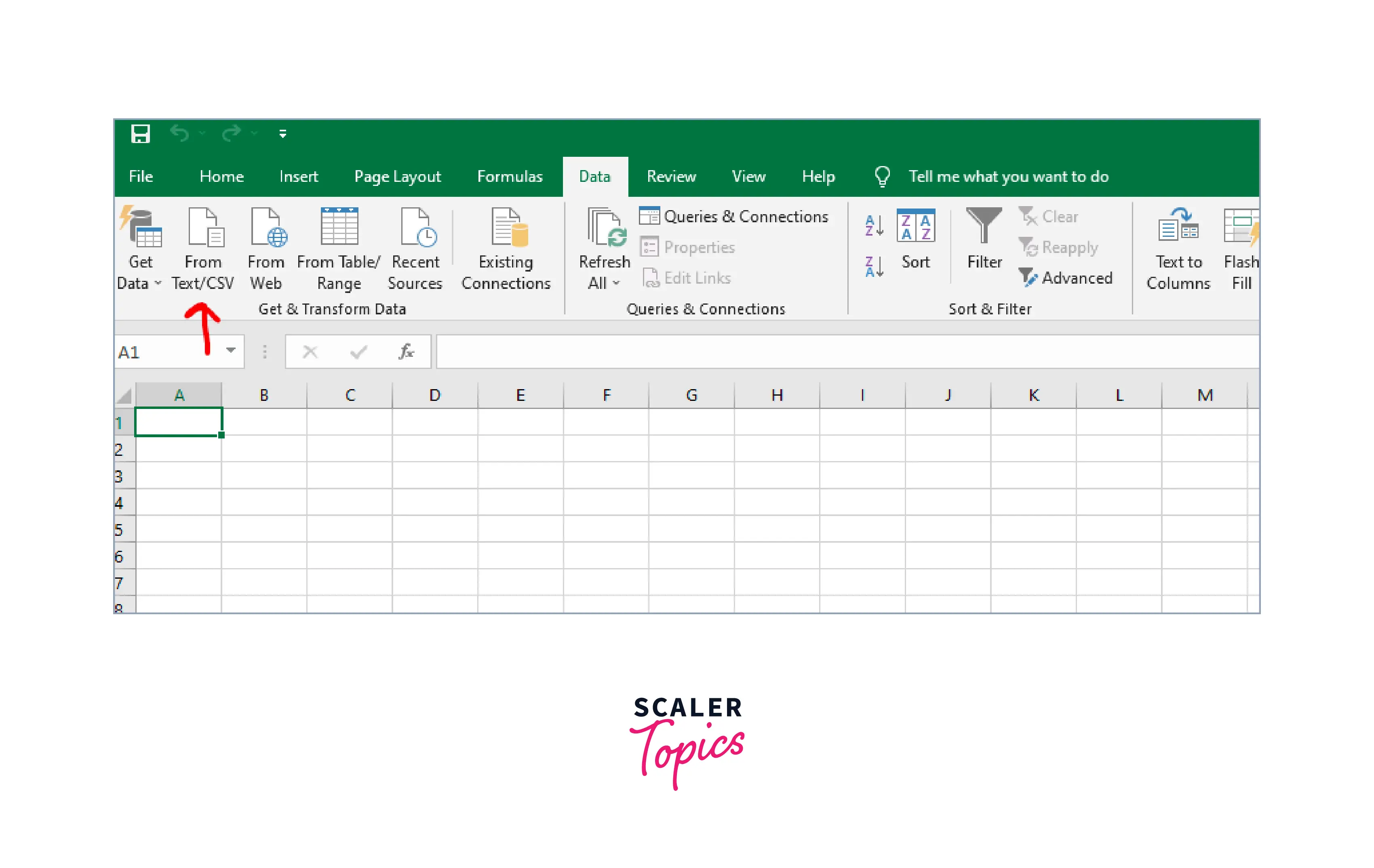 - For that, create a .xlsx file and under Data tab choose From Text/CSV button: