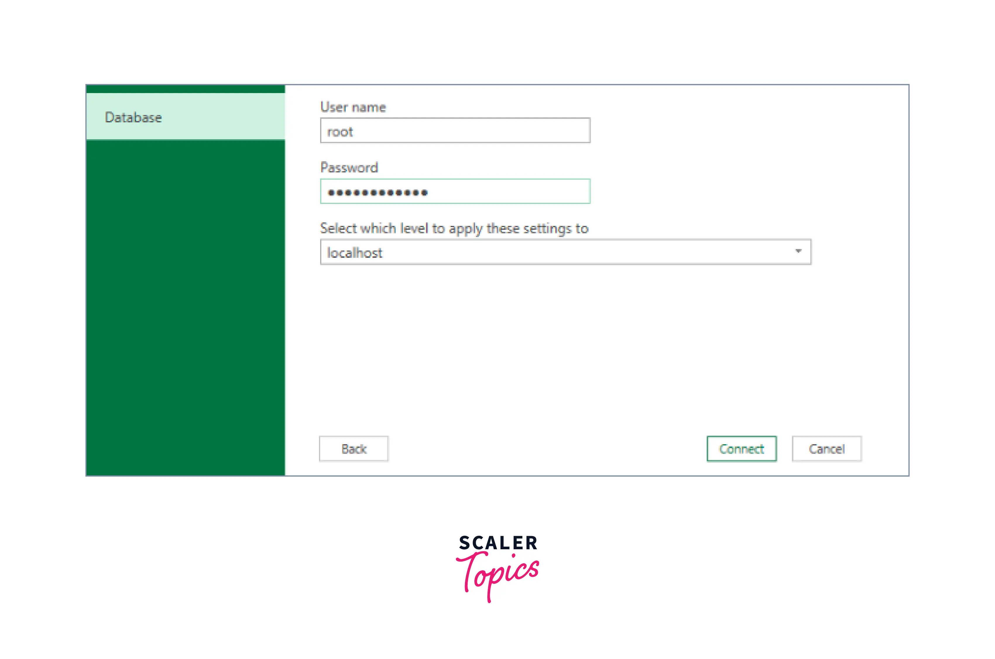 - Under the Database tab of the new dialog window, enter credentials for the user that is having permission to access the targeted database and click the Connect button: