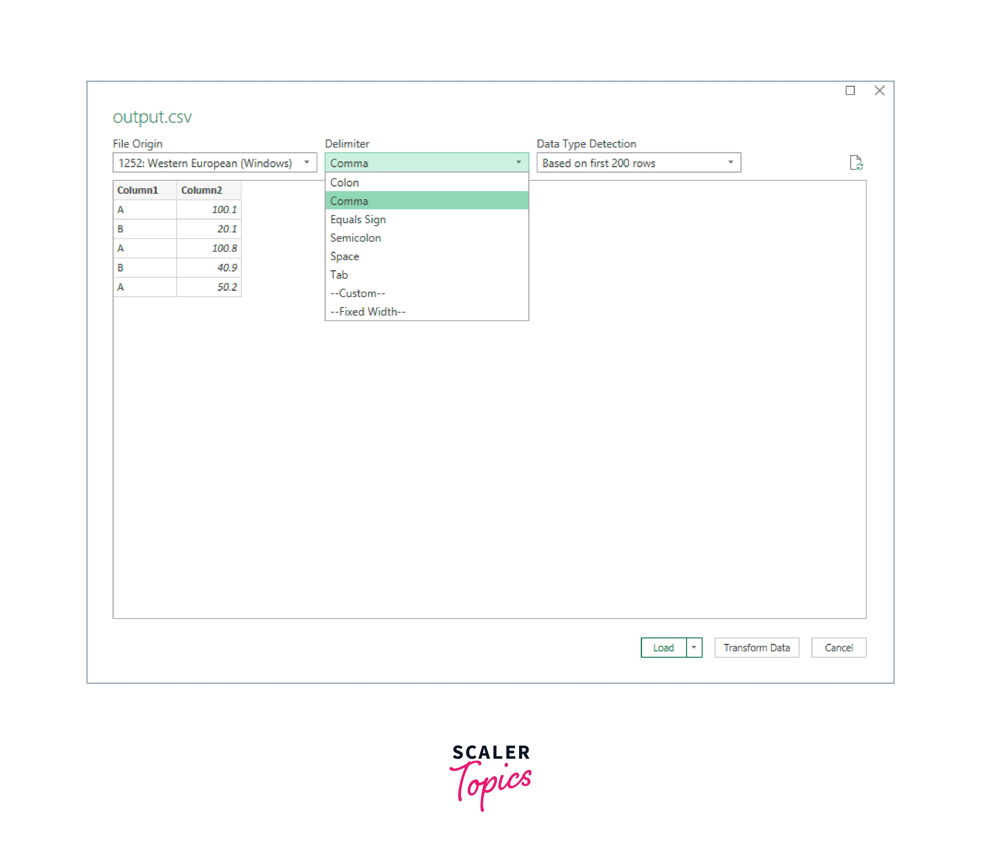 - In the dialog opened after importing, choose the appropriate delimiter and click Transform Data: