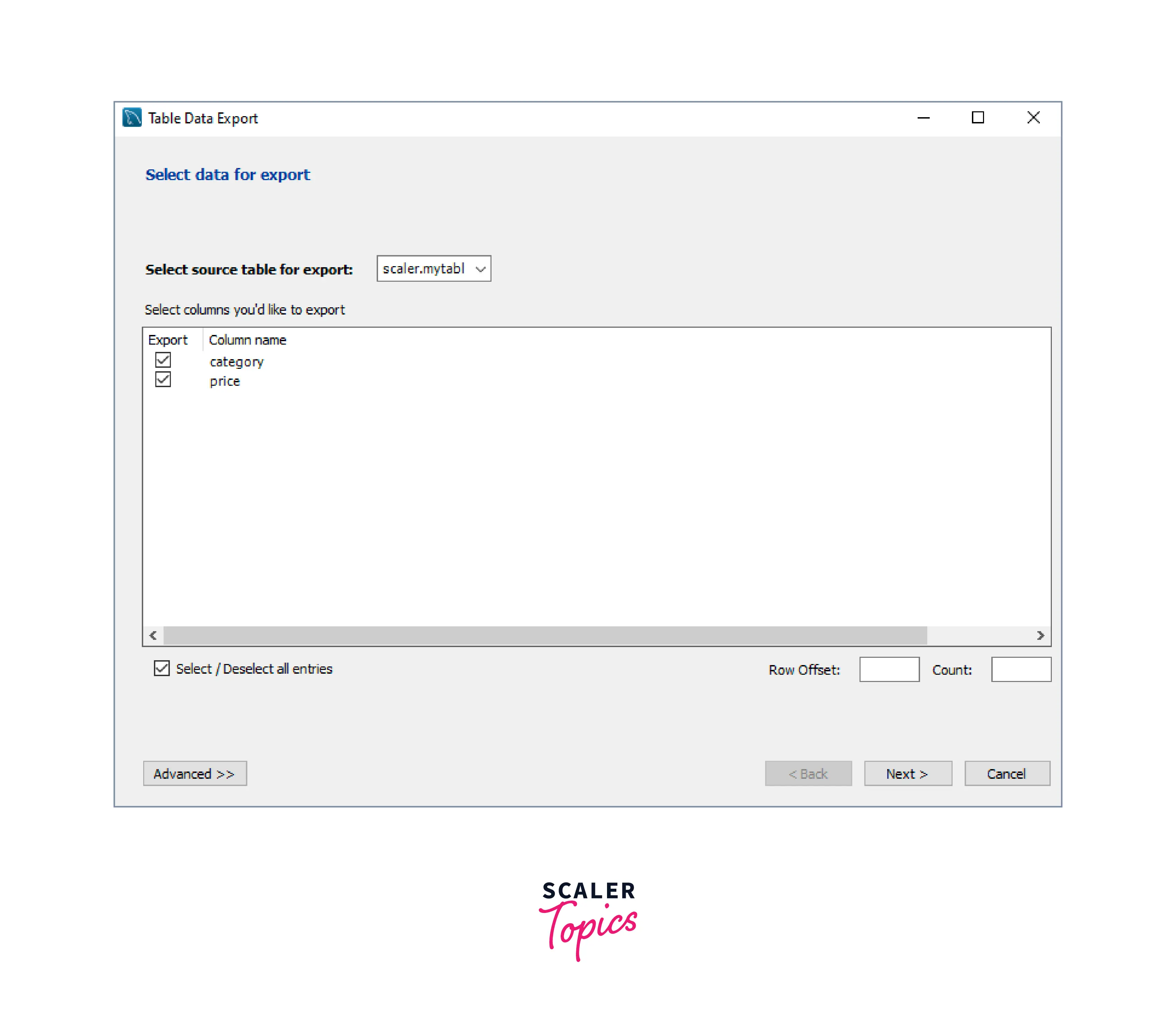 - Wizard will open up displaying available columns, we can also select only desirable columns for export by unselecting the columns we don't want.