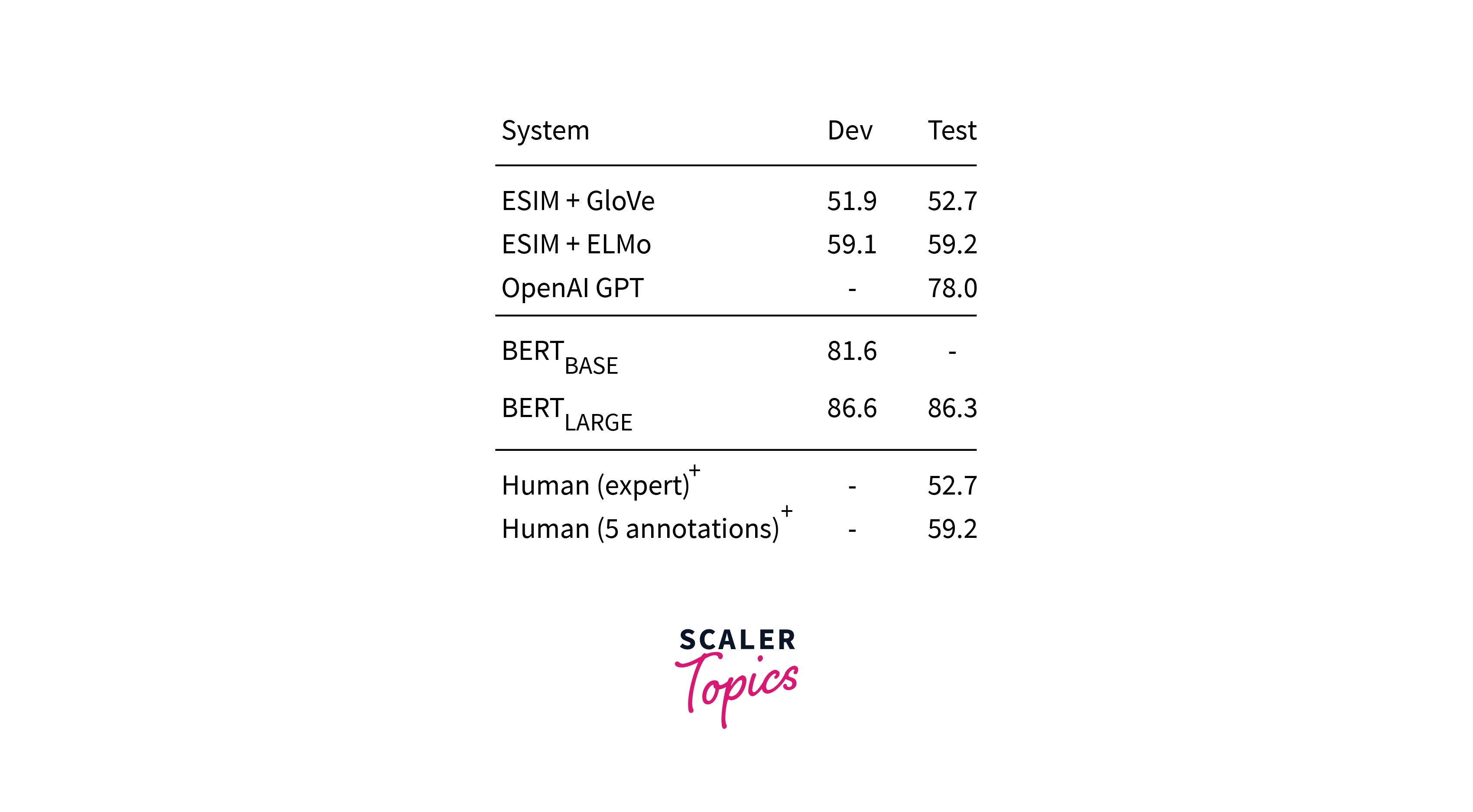 SWAG- Situations With Adversarial Generations is a data set containing 113k sentence completion tasks. Given a sentence, the model should choose the most likely continuation of the sentence among the four choices. In this task, BERT outperforms expert human levels. The results are given below.