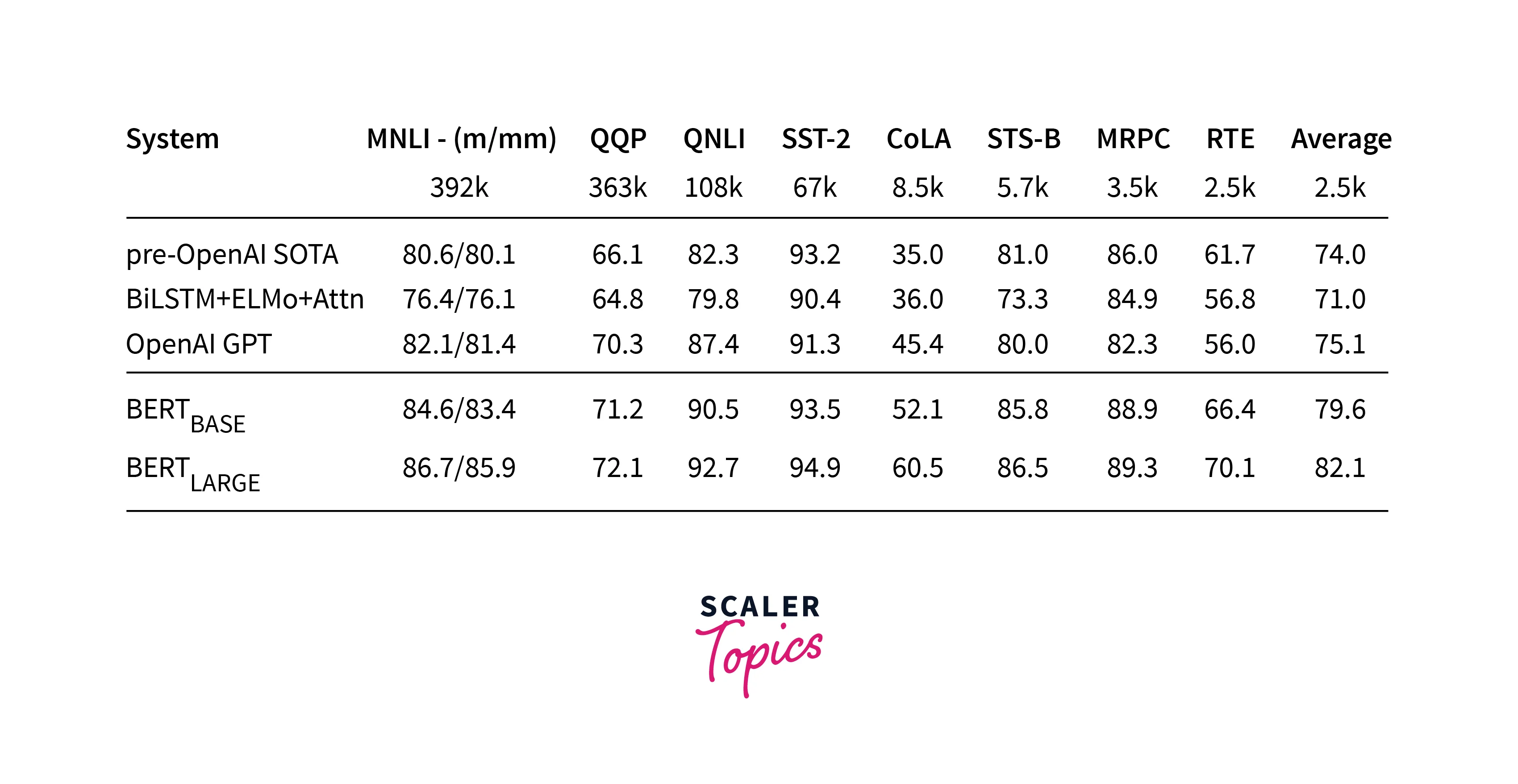 Glue Benchmark-, A variety of Natural Language Understanding tasks are included in the General Language Understanding Evaluation(GLUE) assignment. These include QQP (Quora Question Pairs), MNLI (Multi-Genre Natural Language Inference), SST-2 (The Stanford Sentiment Treebank), CoLA (Corpus of Linguistic Acceptability), and QNLI (Question Natural Language Inference). BERT outperforms all previous models by some margin.