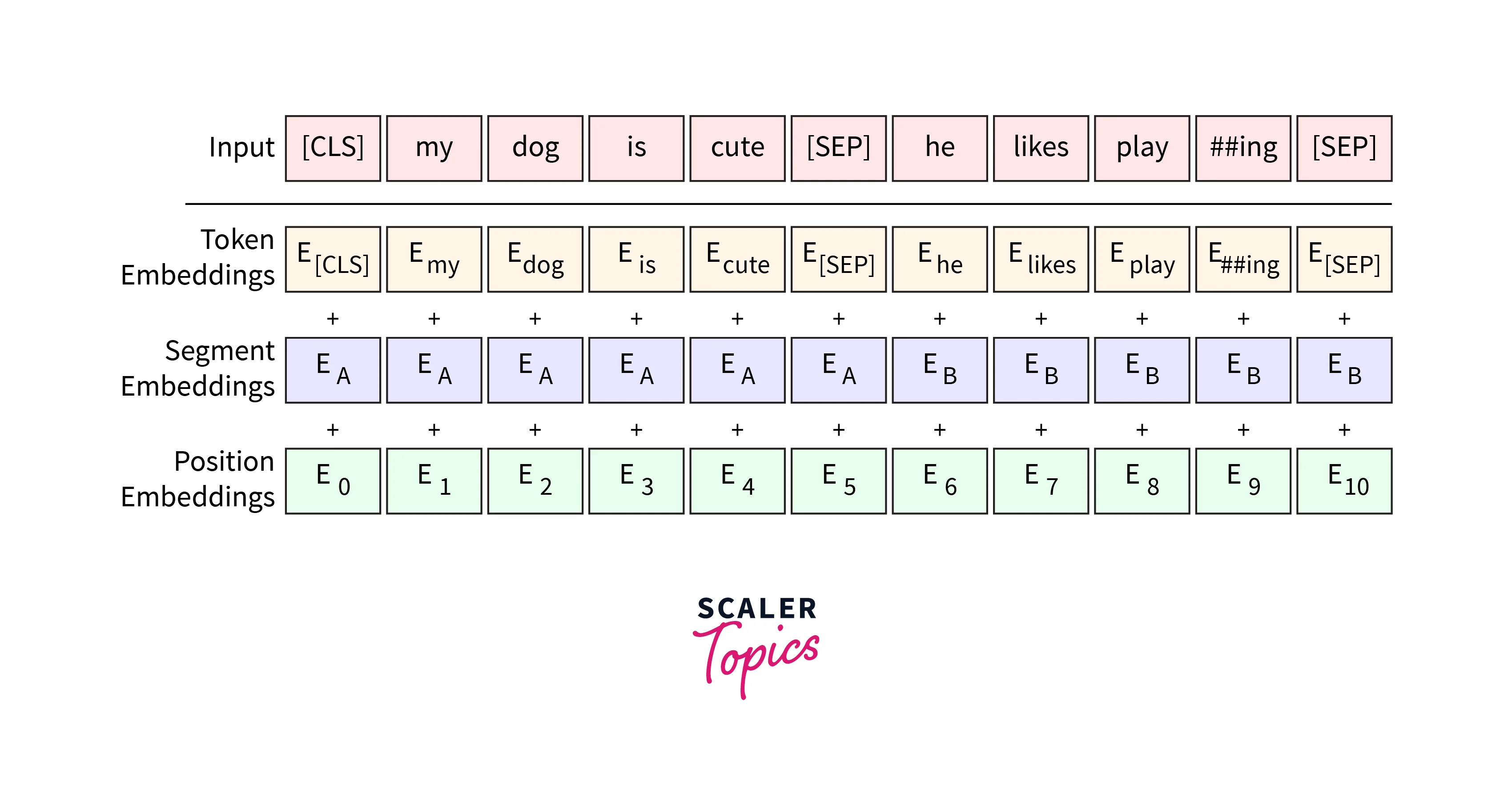 - Token Embedding: This gets embeddings for each word from the Wordpiece Tokenizer Vocabulary. It maps different values to different words.