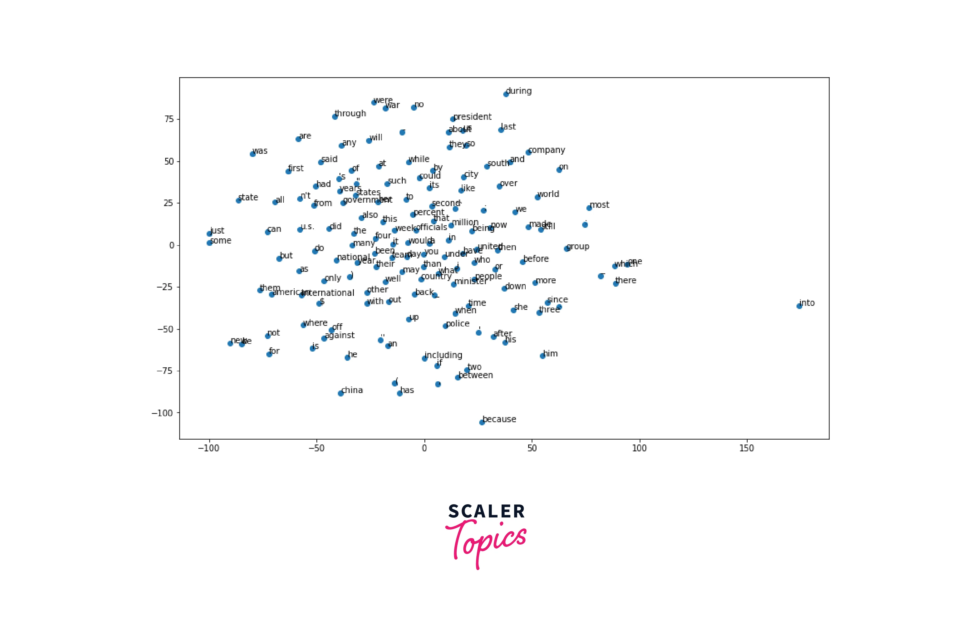 Visualizing them in the 2D space can give a sense of how similar or dissimilar the words are in their meanings. The t-SNE algorithm maps the high-dimensional vectors to a 2D space, where similar vectors are mapped to nearby points, and different vectors are mapped to farther points.