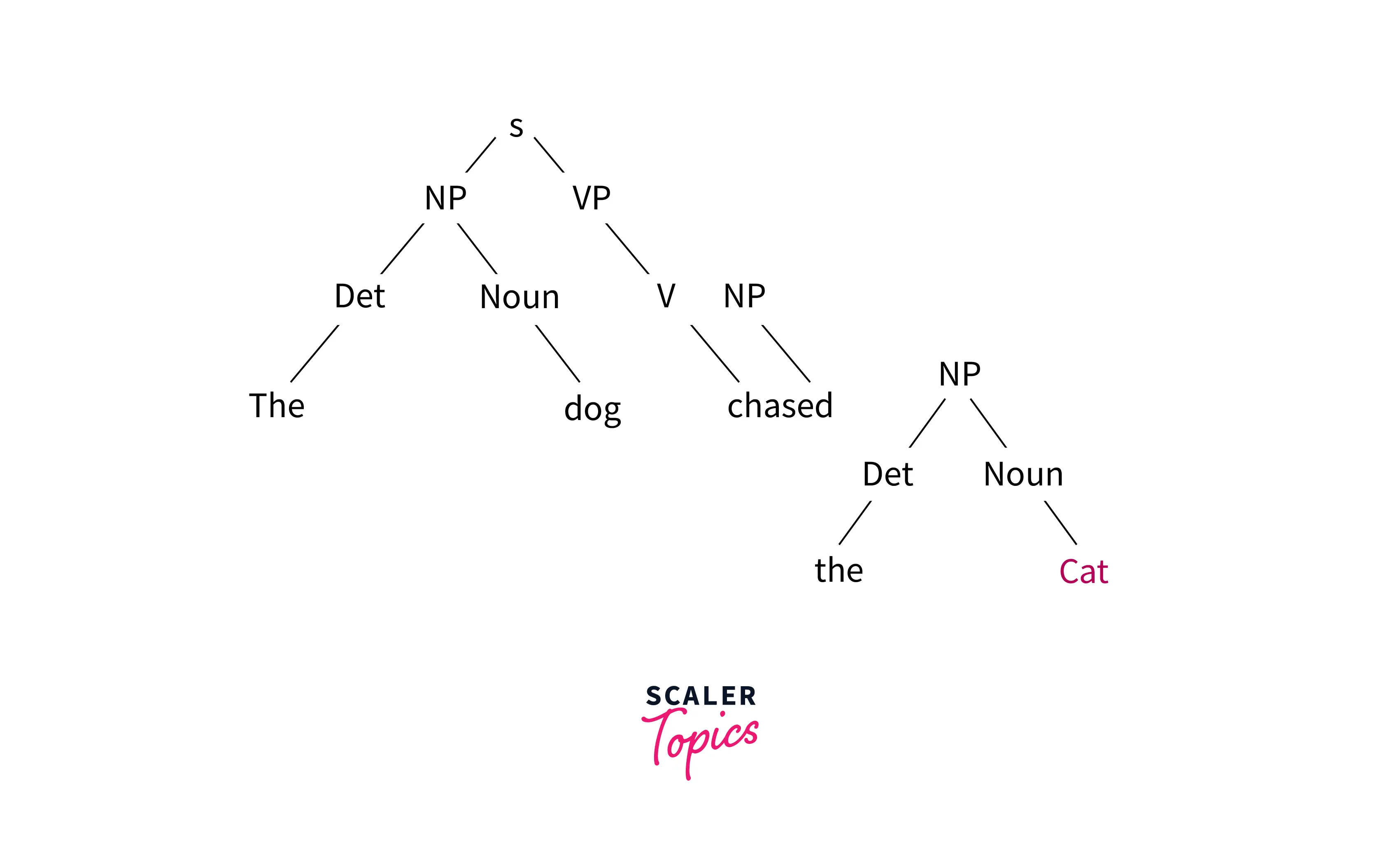 - The NP is further broken down into Det (determiner) and Noun, and the VP is further broken down into V (verb) and NP.