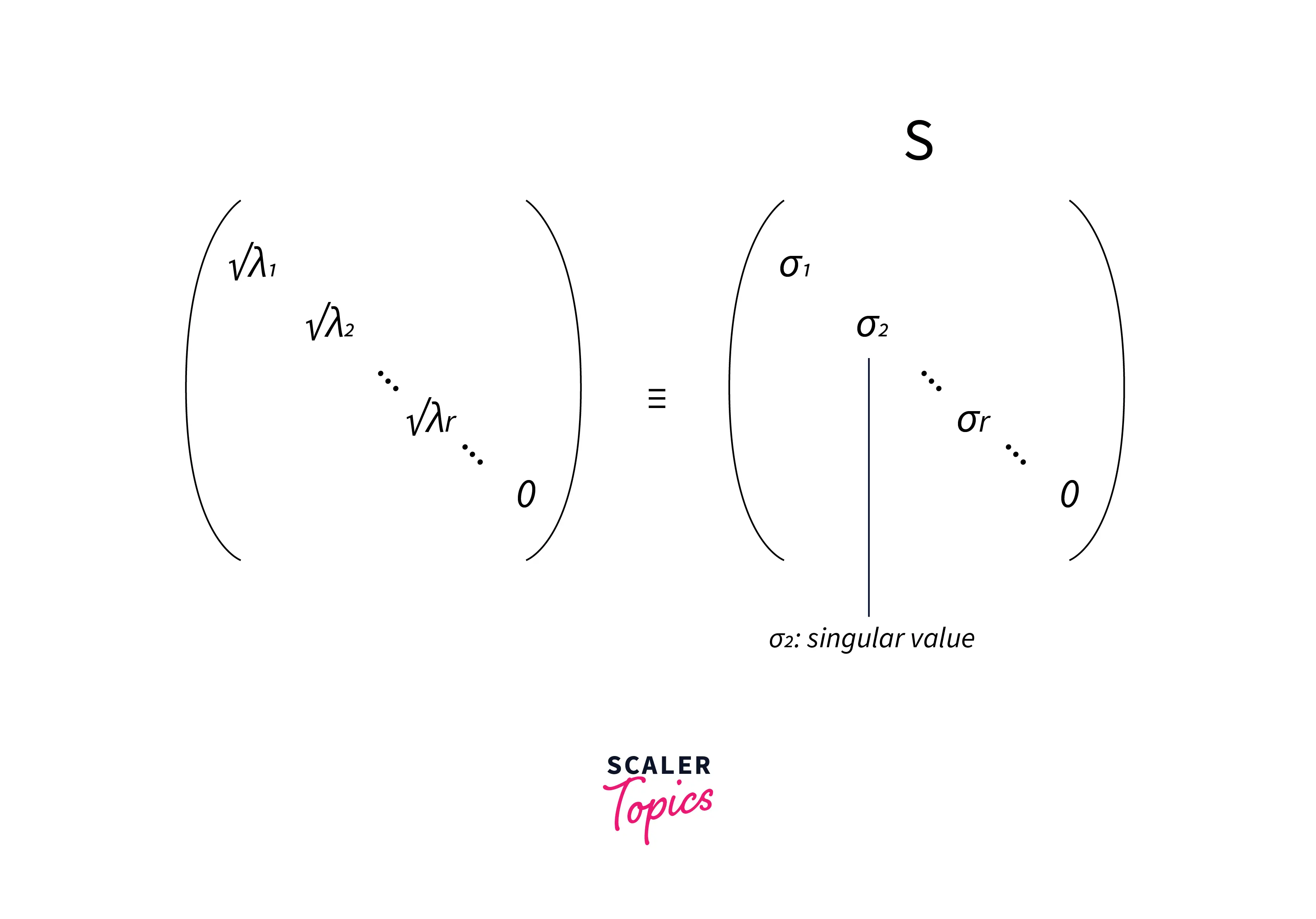 - S is a diagonal matrix with r elements equal to the square root of the positive eigenvalues of AAᵀ or Aᵀ A (both matrics have the same positive eigenvalues).