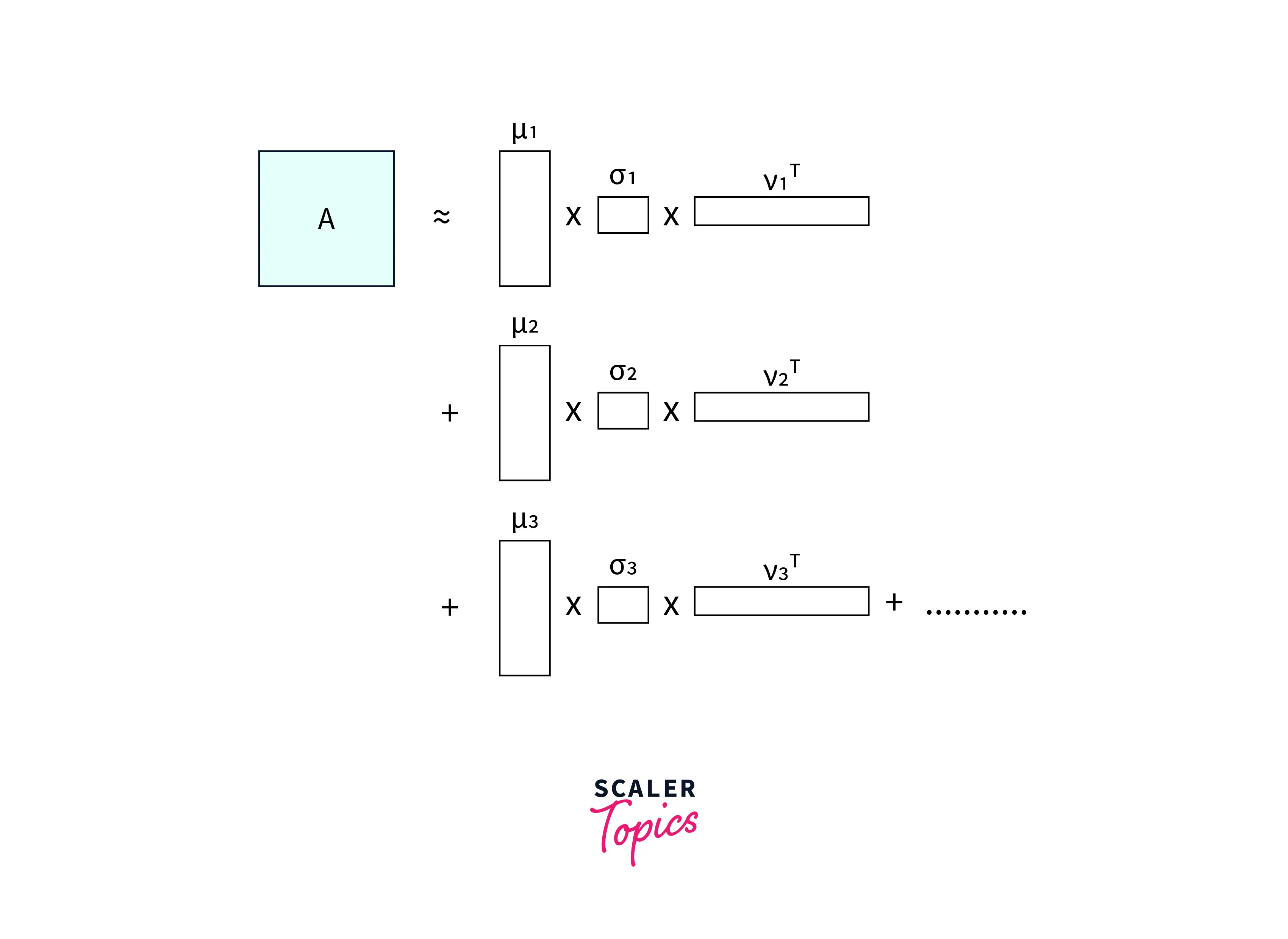 Now we can easily see that If A is our original data matrix we can approximate A as its summation of singular values, eigen vectors multiplication: