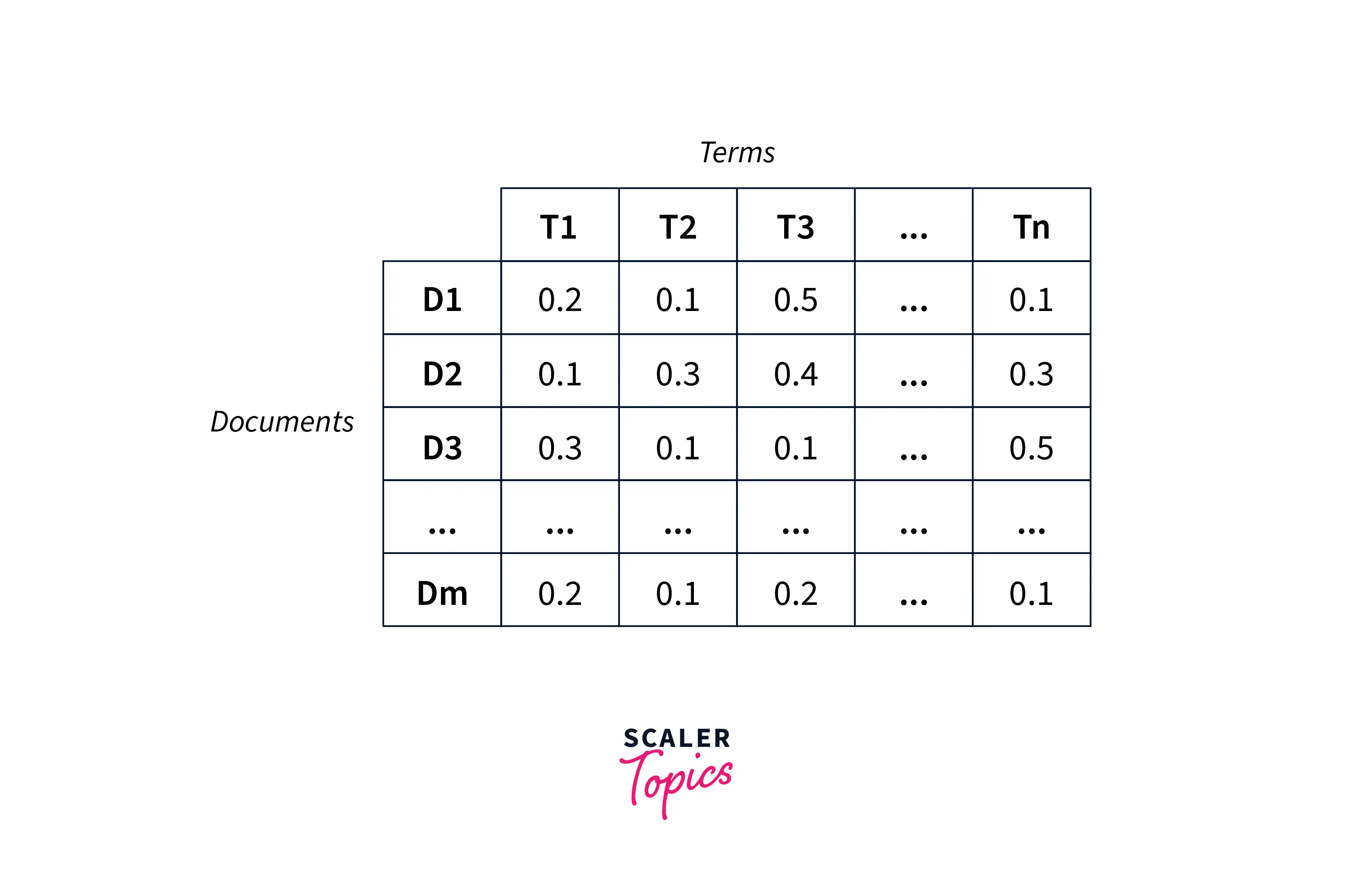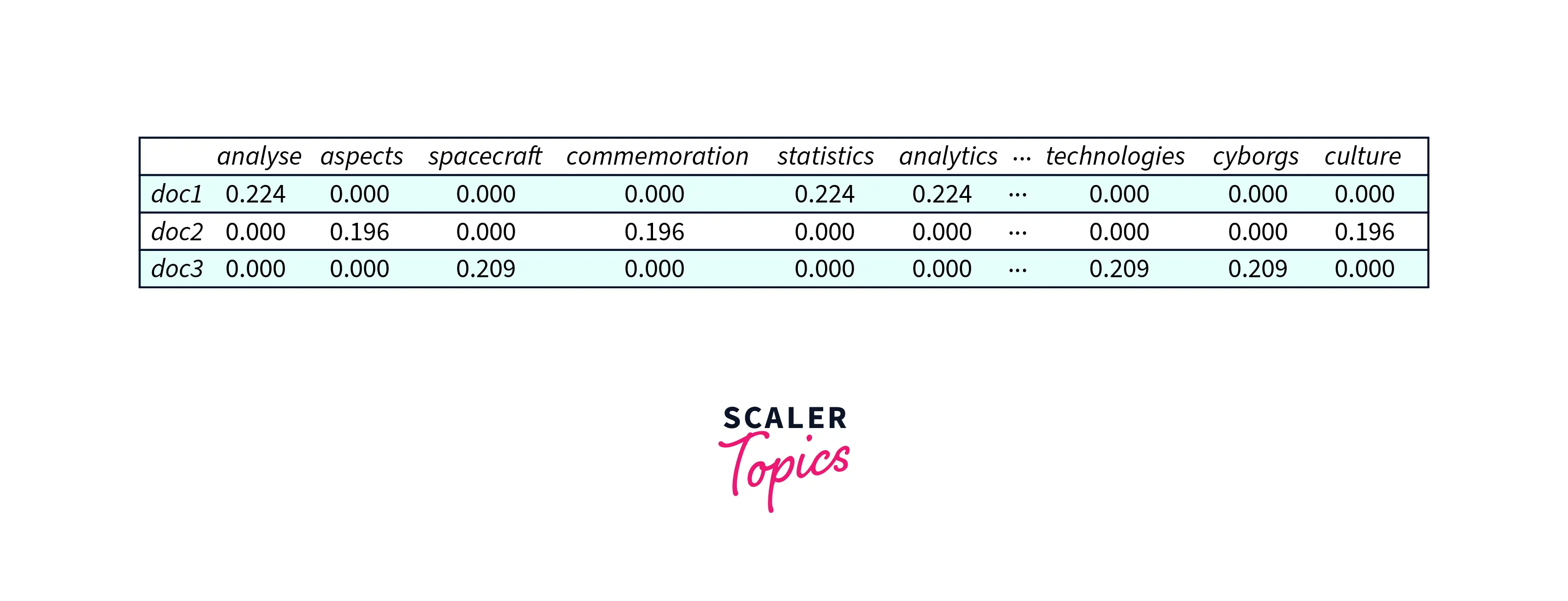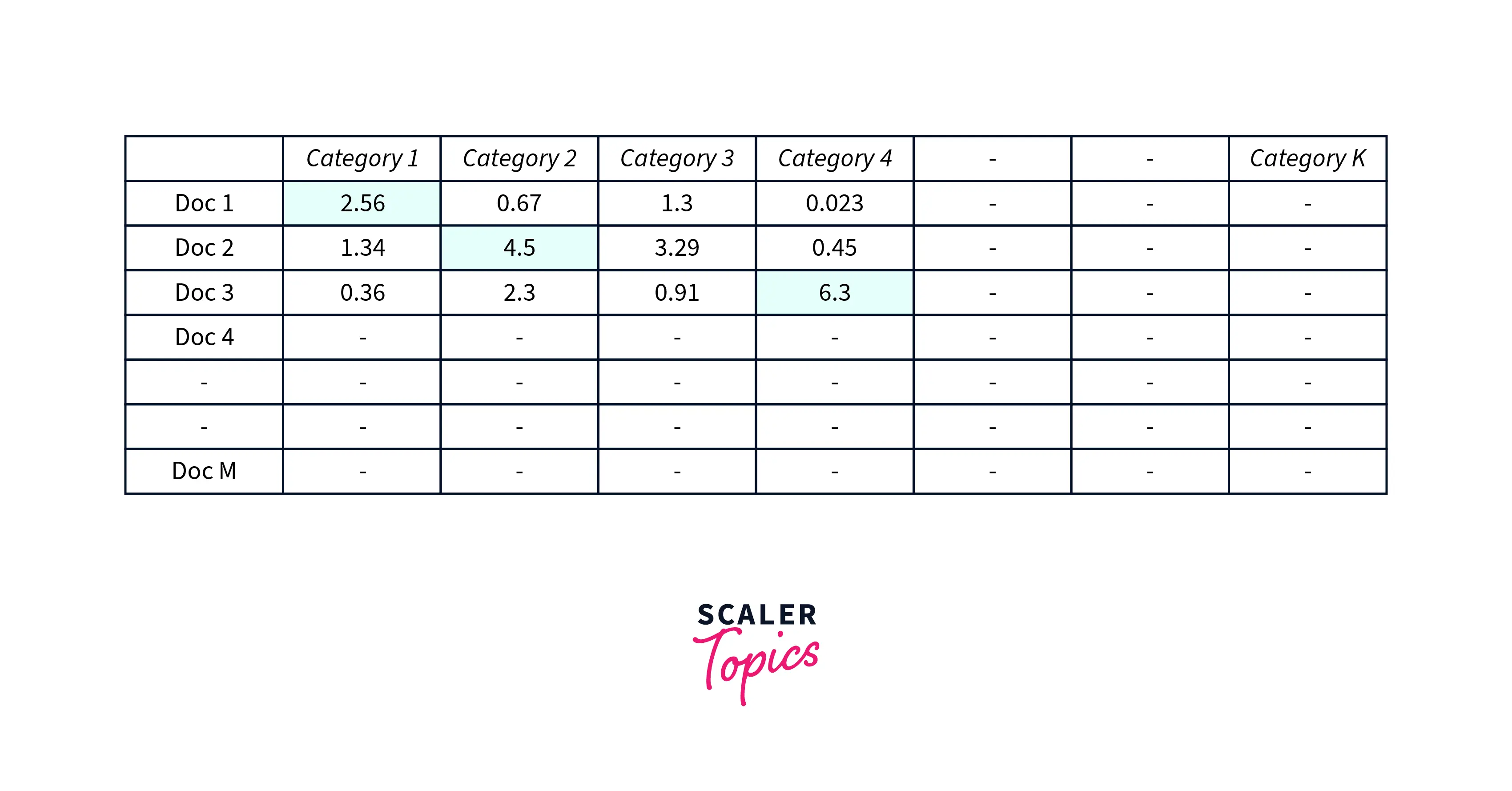 Here, In the cells, we would have different numbers that indicated how strongly that document belongs to the particular topic.