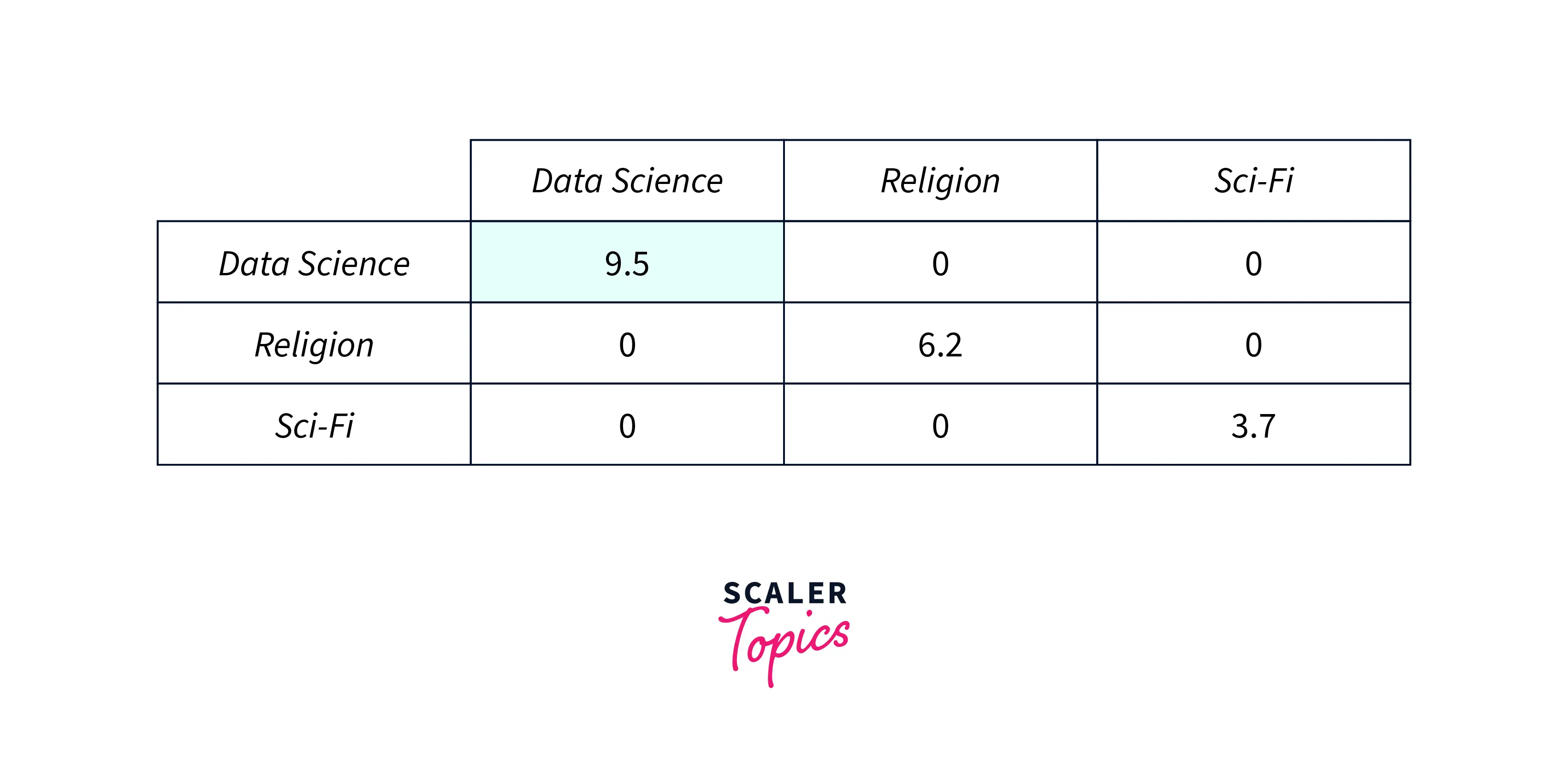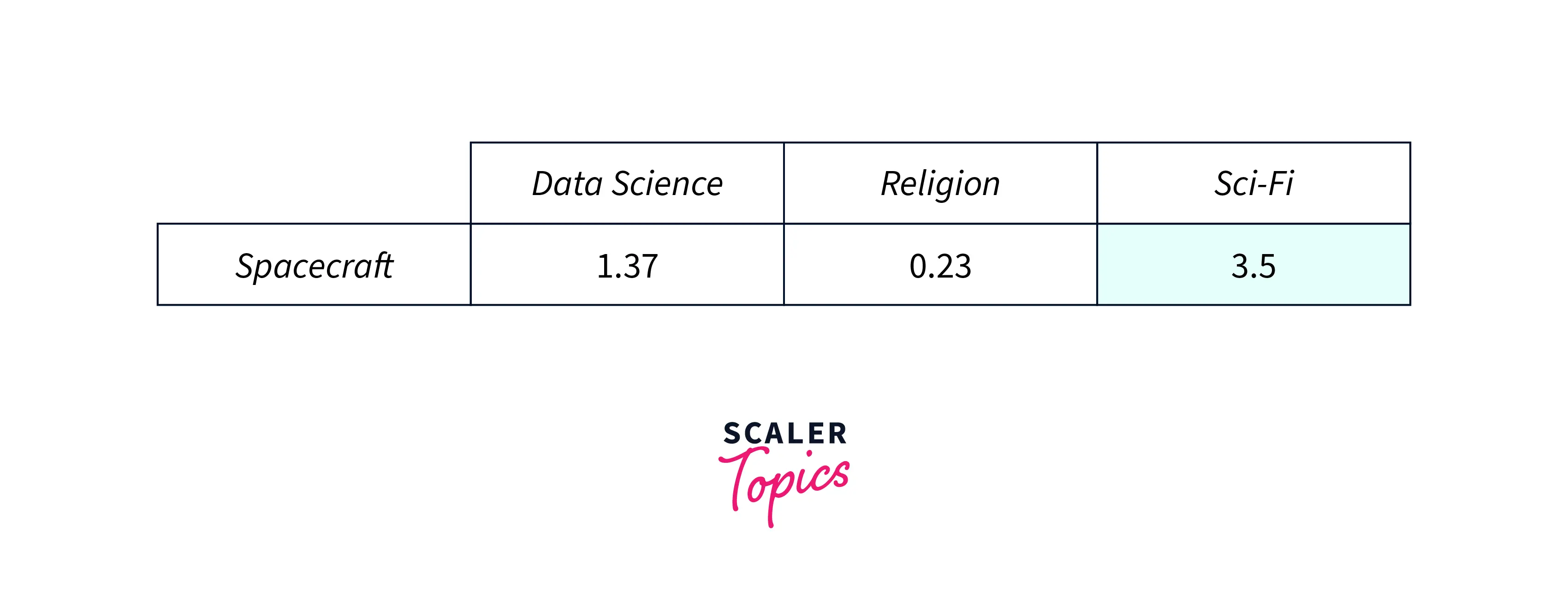 e.g. word/term "spacecraft" is more likely to fall in the "sci-fi" category, therefore its cell value will be higher for the "sci-fi" category