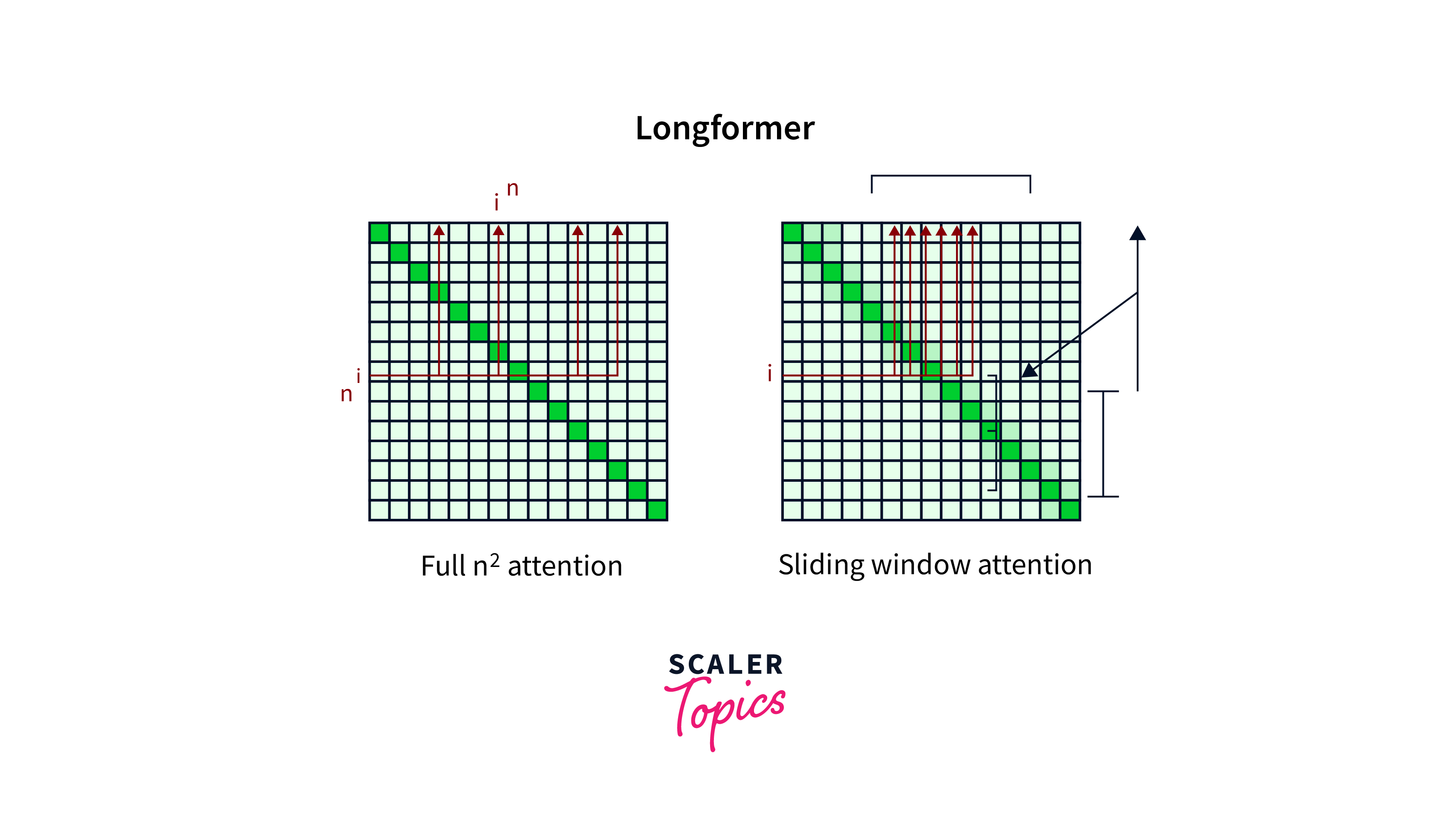 LongFormer suggests a sparsified version of self-attention, in which the entire self-attention matrix is divided into smaller chunks in accordance with a "attention pattern" that designates pairings of input sites that are paying attention to one another. The proposed attention pattern scales linearly with the input sequence, unlike the complete self-attention, making it effective for longer sequences. Let's examine the Attention Pattern's elements.