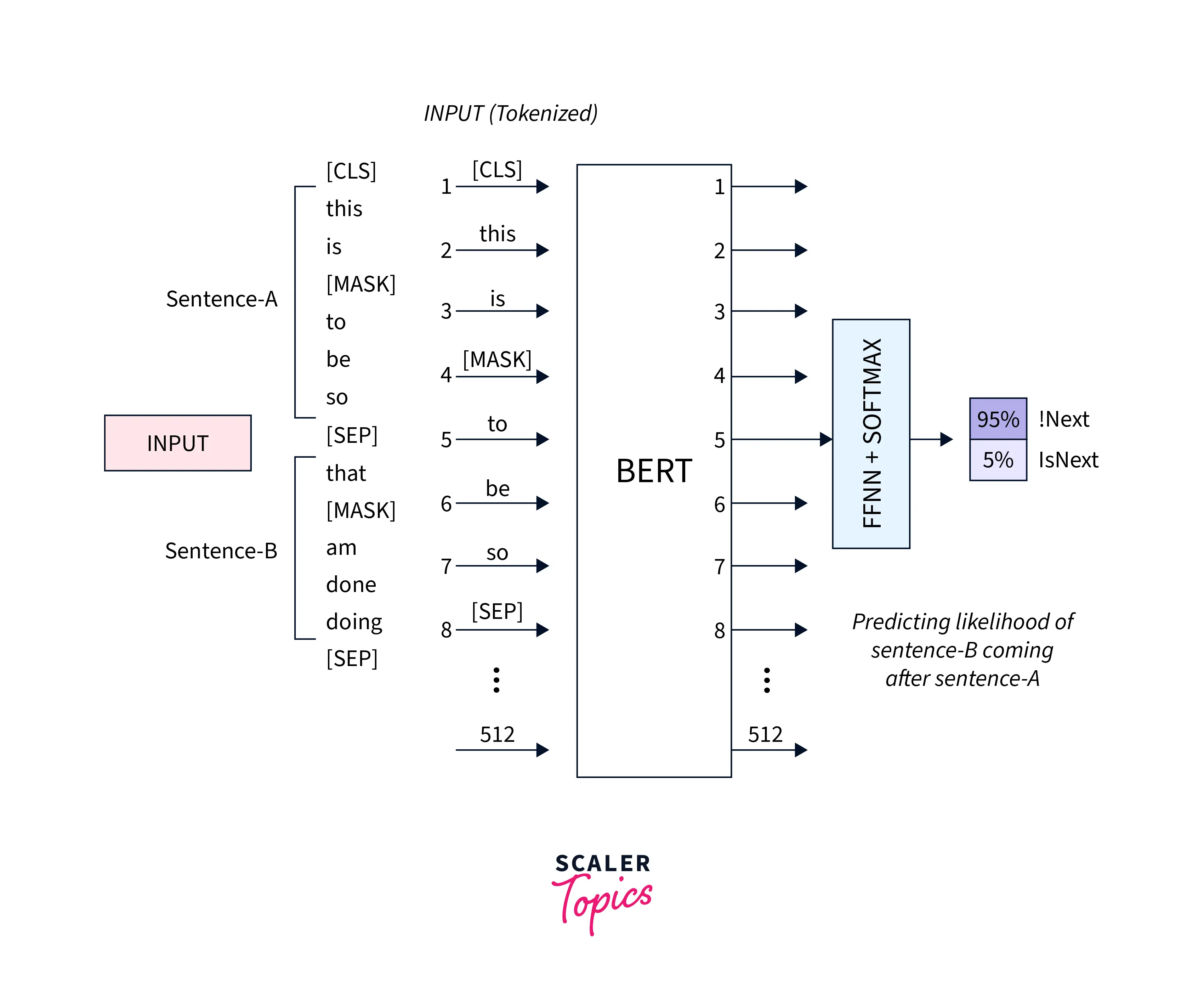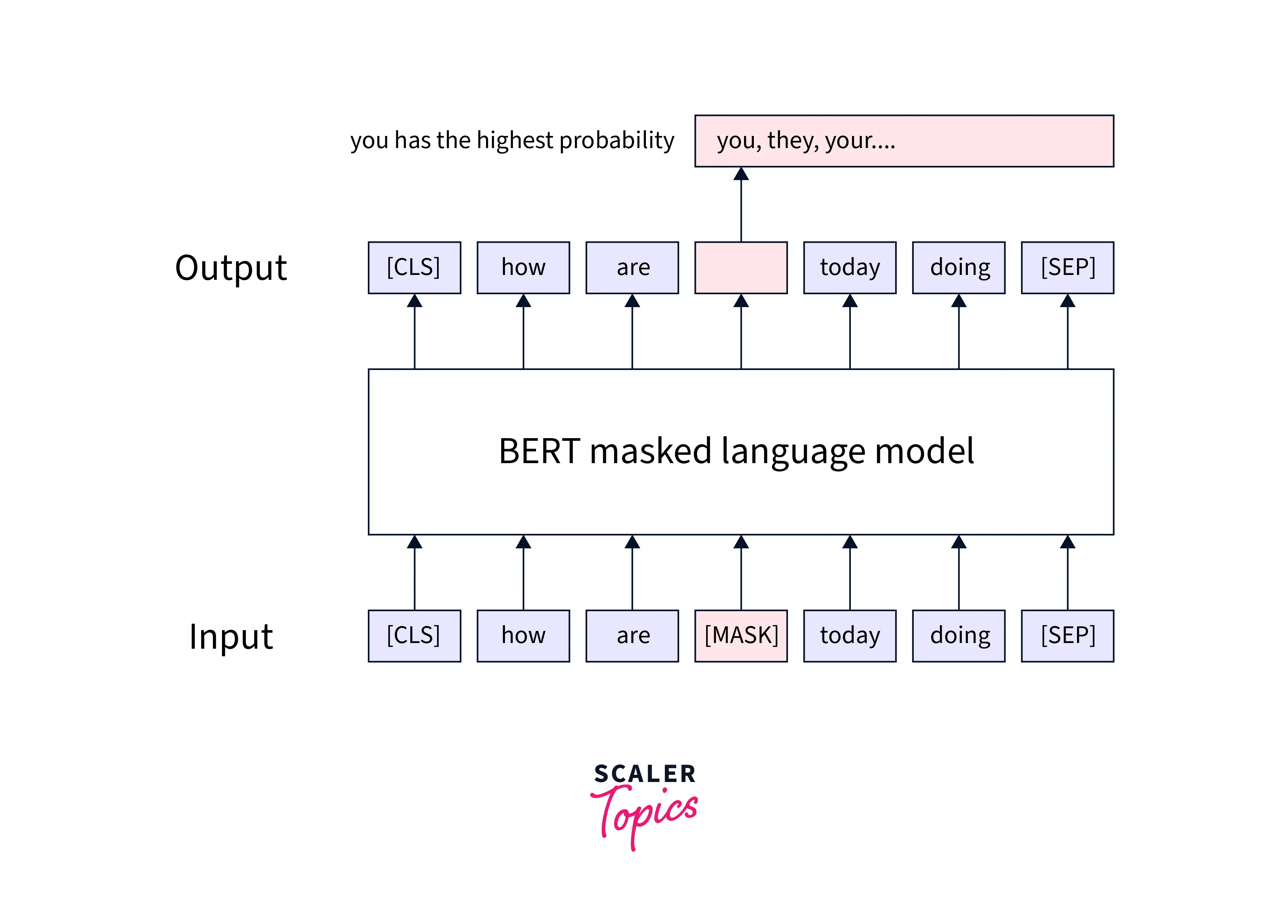 From the word sequence, 15% of the words were masked ([MASK] tokens) before feeding the word into BERT. The model then predicts the original masked words based on the sequence's context of other unmasked words. For prediction, it requires to: The output of the encoder is added to a classification layer. The vocabulary dimension is created by dividing the output vectors by the embedding matrix. Use softmax to determine the likelihood of each word in the lexicon.