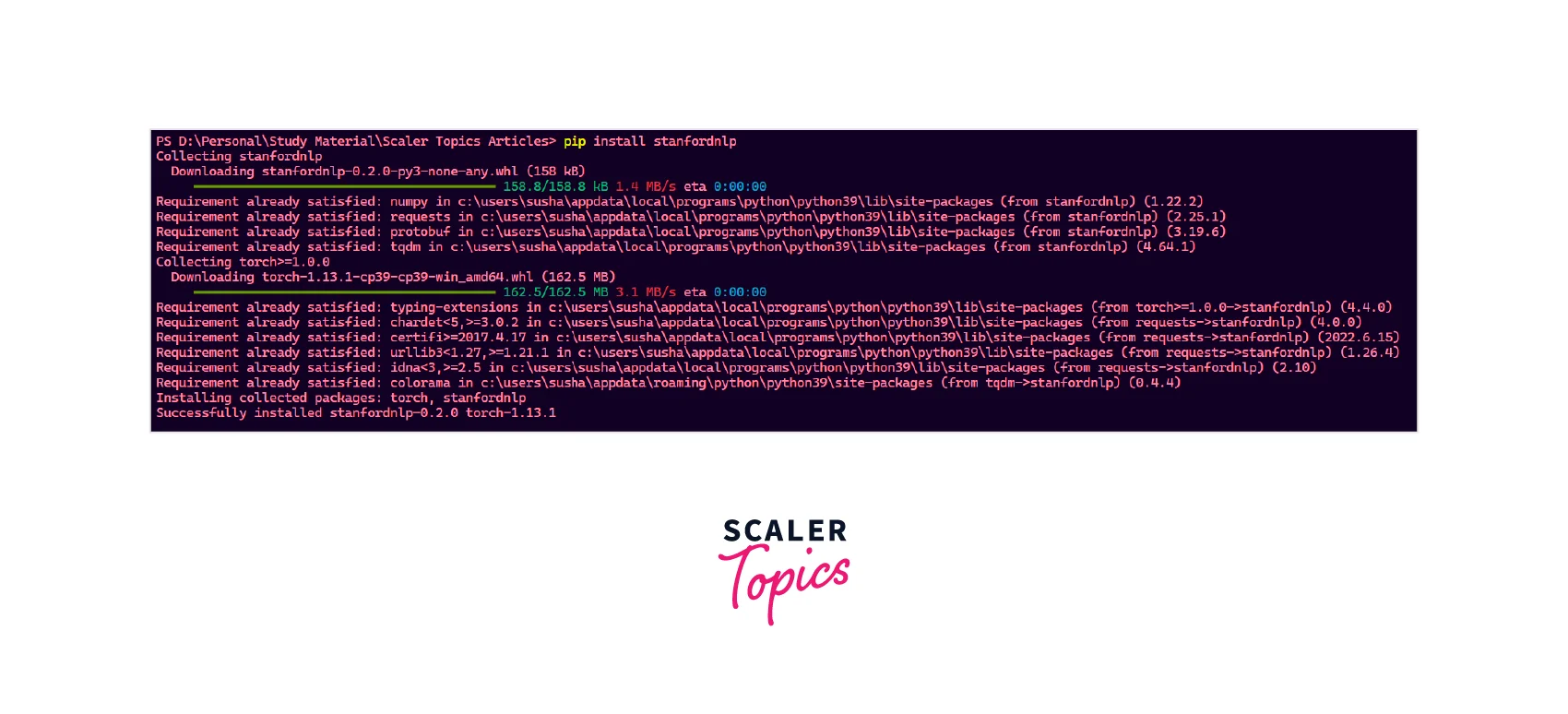 - Install the StanfordNLP library on the local environment. Use the below commands.