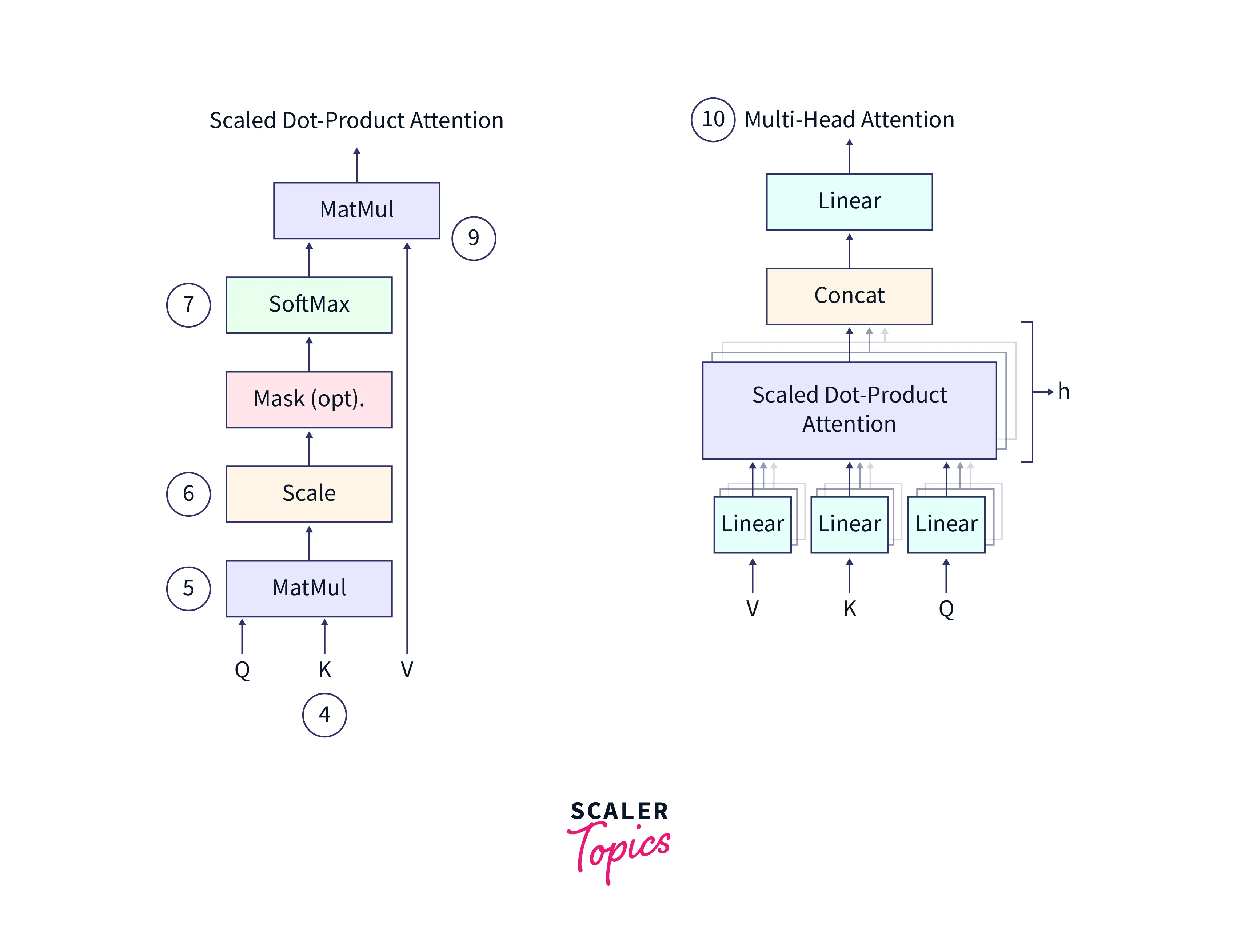 (10) The self-attention process is repeated for each word in the input sequence. Since the attention weights for each word do not depend on the other words in the sequence, multiple copies of the self-attention module can be used to process the input simultaneously, making the attention mechanism multi-headed. This allows the model to attend to different input parts and capture more complex dependencies between the input elements.