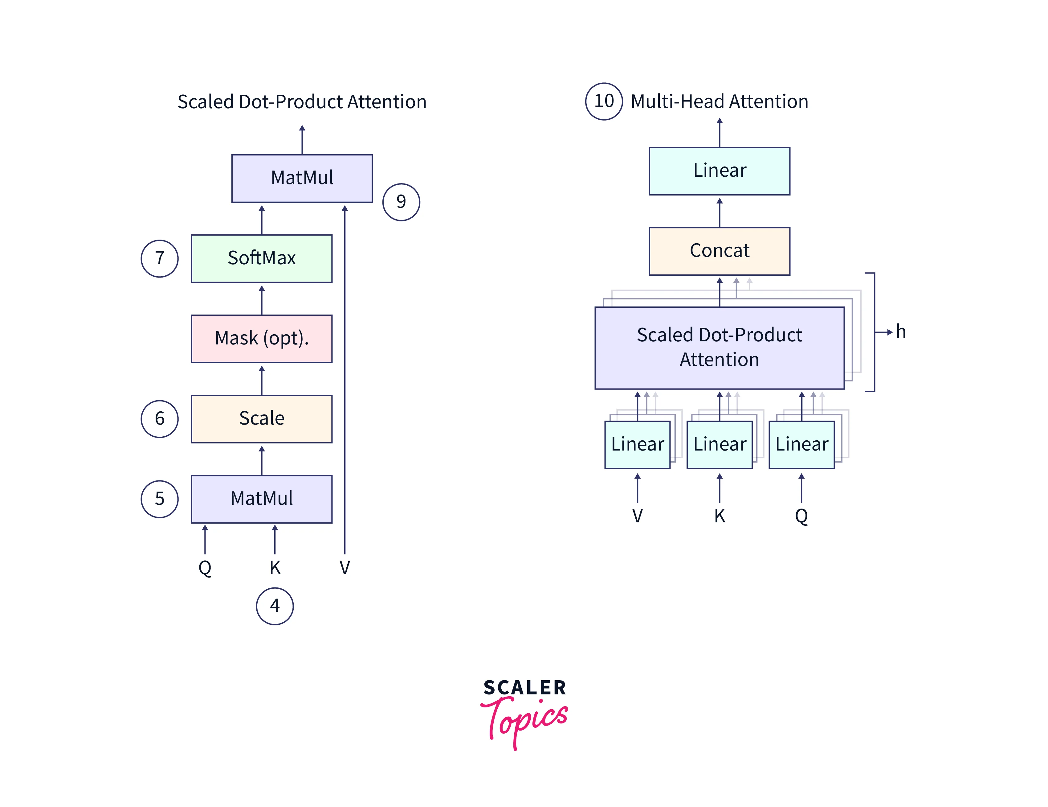 The diagrams above illustrate the Multi-Headed Attention mechanism in detail. Points (4) through (10) are based on the annotations in the image above.