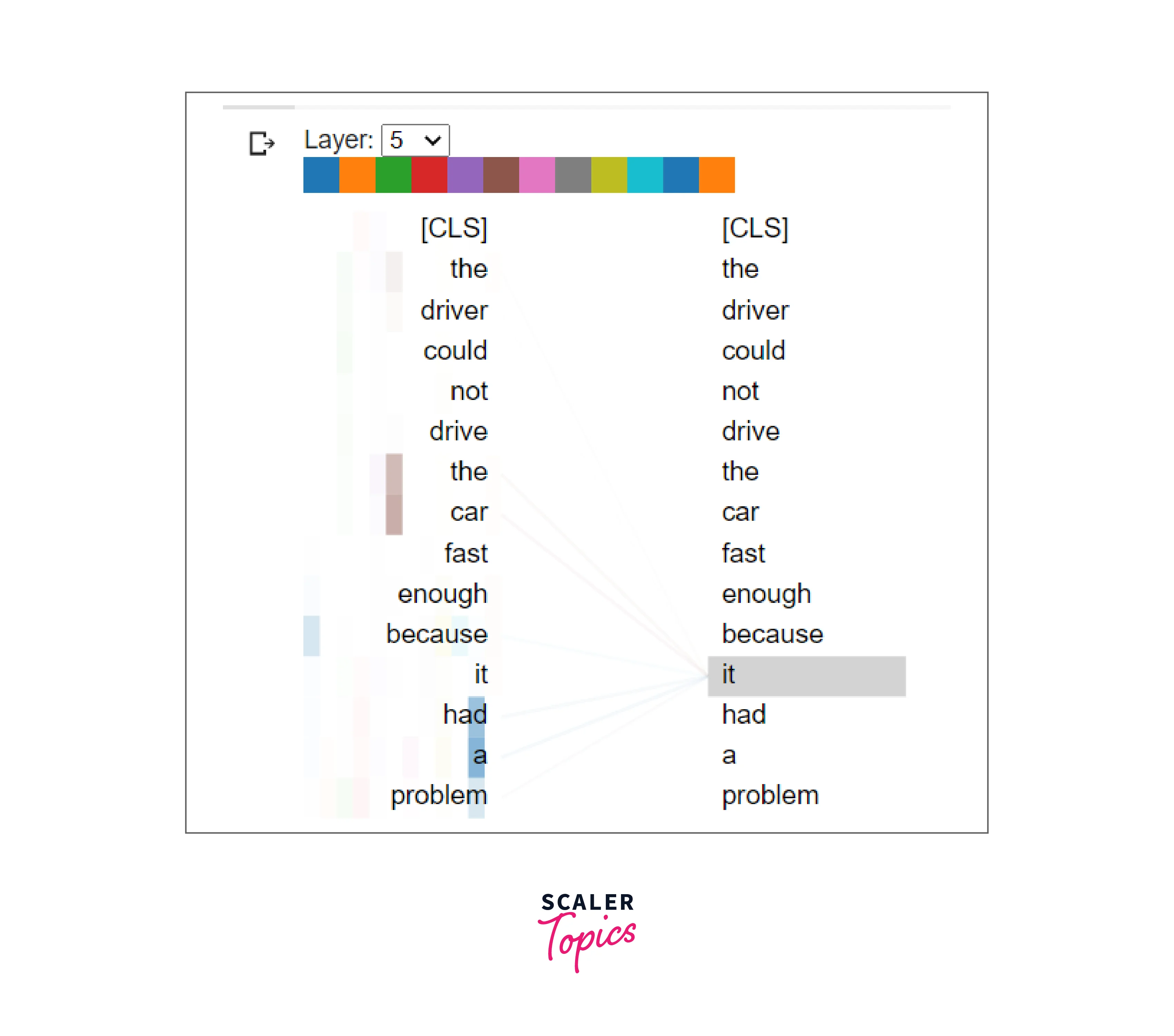 The illustration shows a learned model's attention weights, representing how much the model paid attention to each word in the input sequence when encoding it. The model was able to attend to the word "car" more than any other word when encoding the word "it", which suggests that it was able to understand the context and determine that "it" was referring to the car rather than the driver.