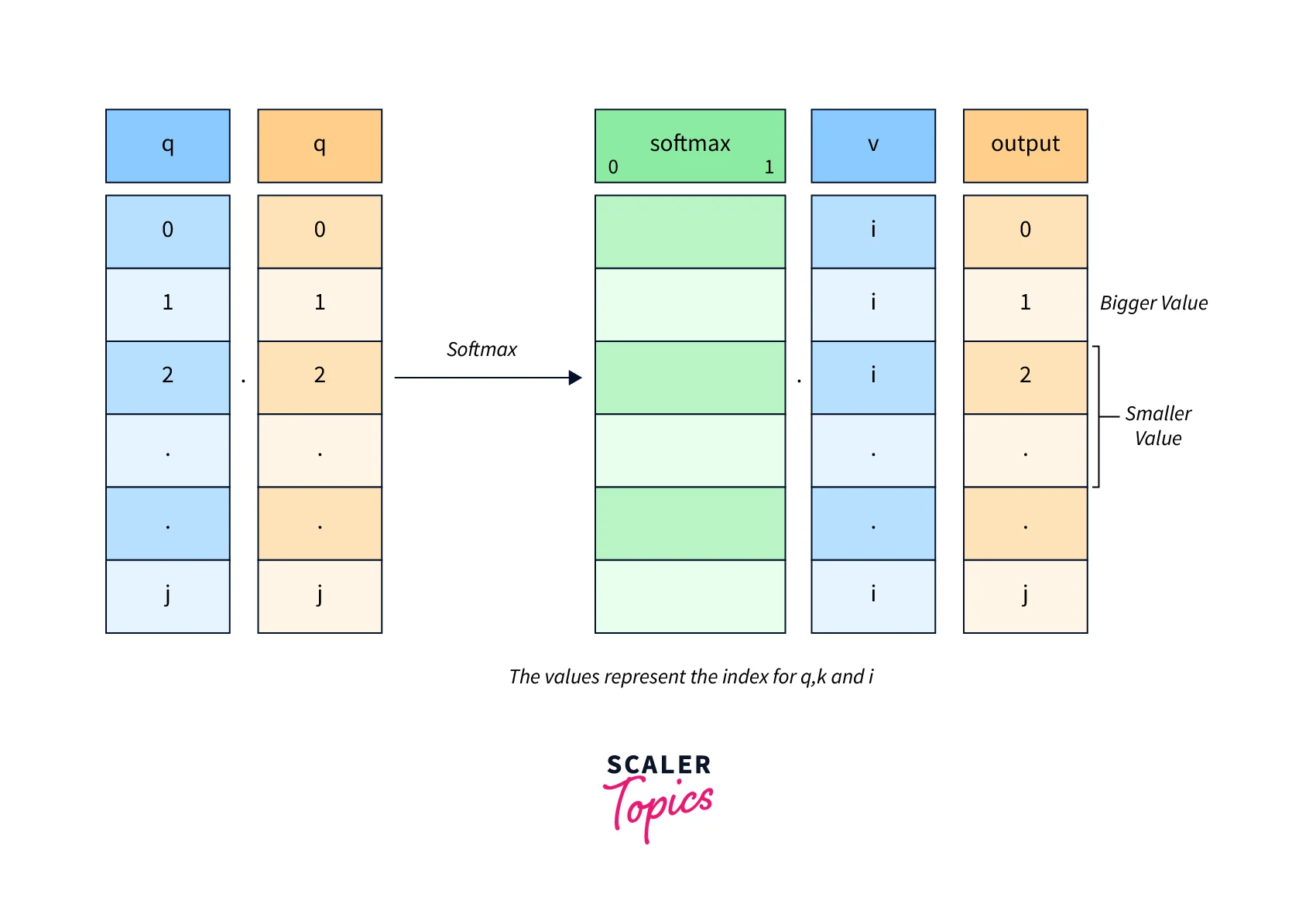 - This is followed by a softmax that will drive the q.k with smaller values close to 0 and q.k with larger values towards 1.