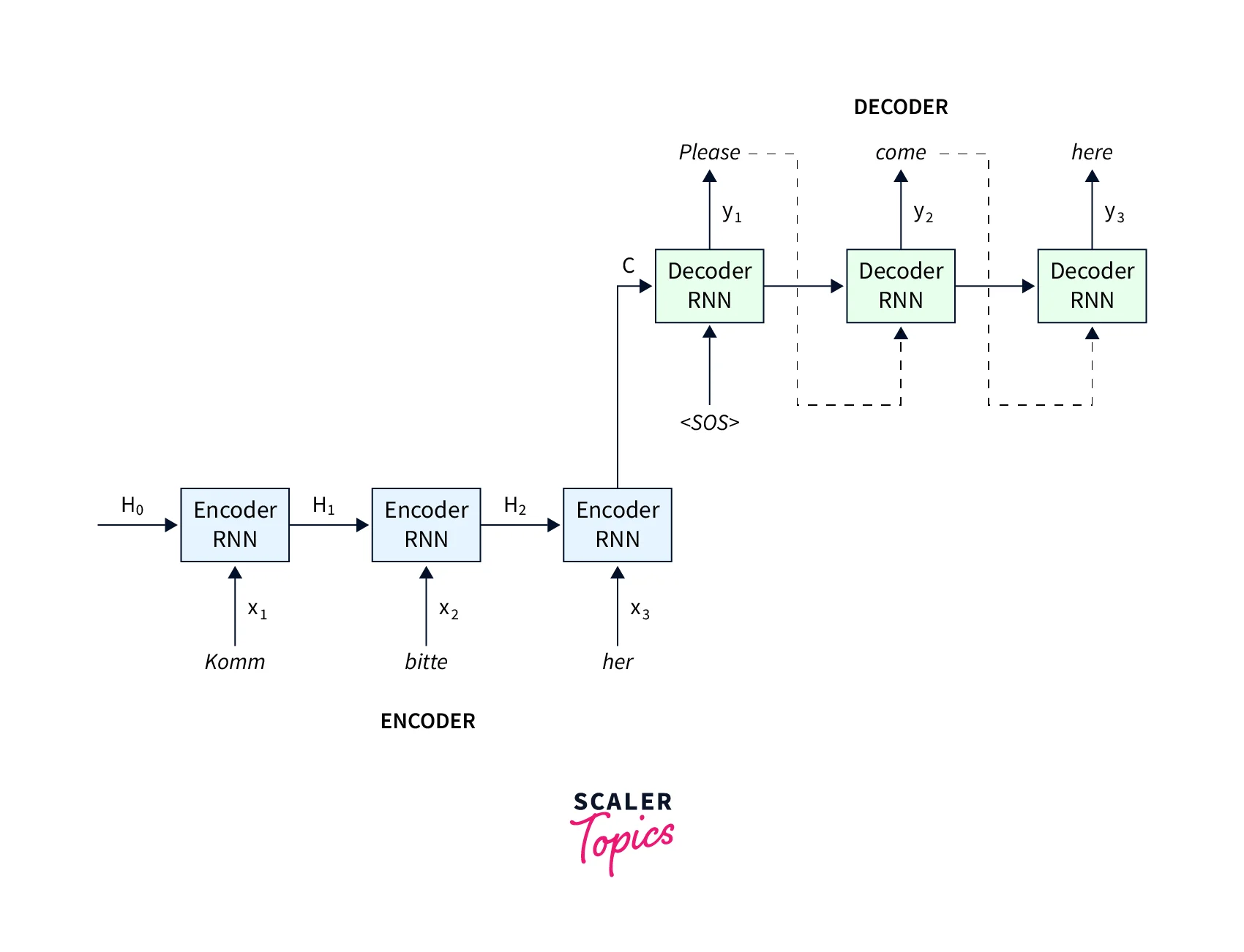 - At every time step in the Encoder, the RNN takes a word vector (xi) from the input sequence(sequentially) and a hidden state (Hi) from the previous time step.