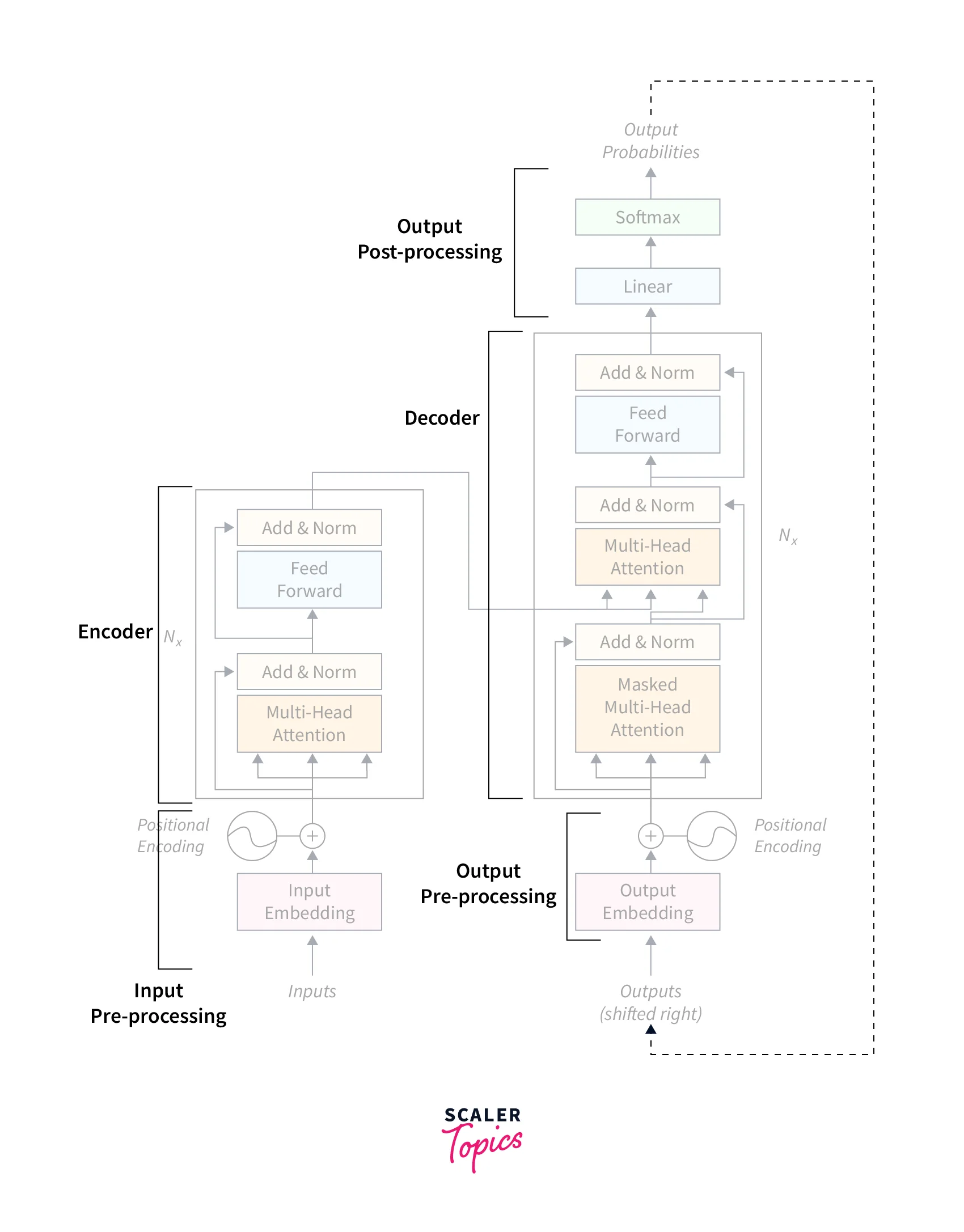 We can break down this complex architecture into several small parts: The Encoder, the decoder, the input and output preprocessing, and the output post-processing.