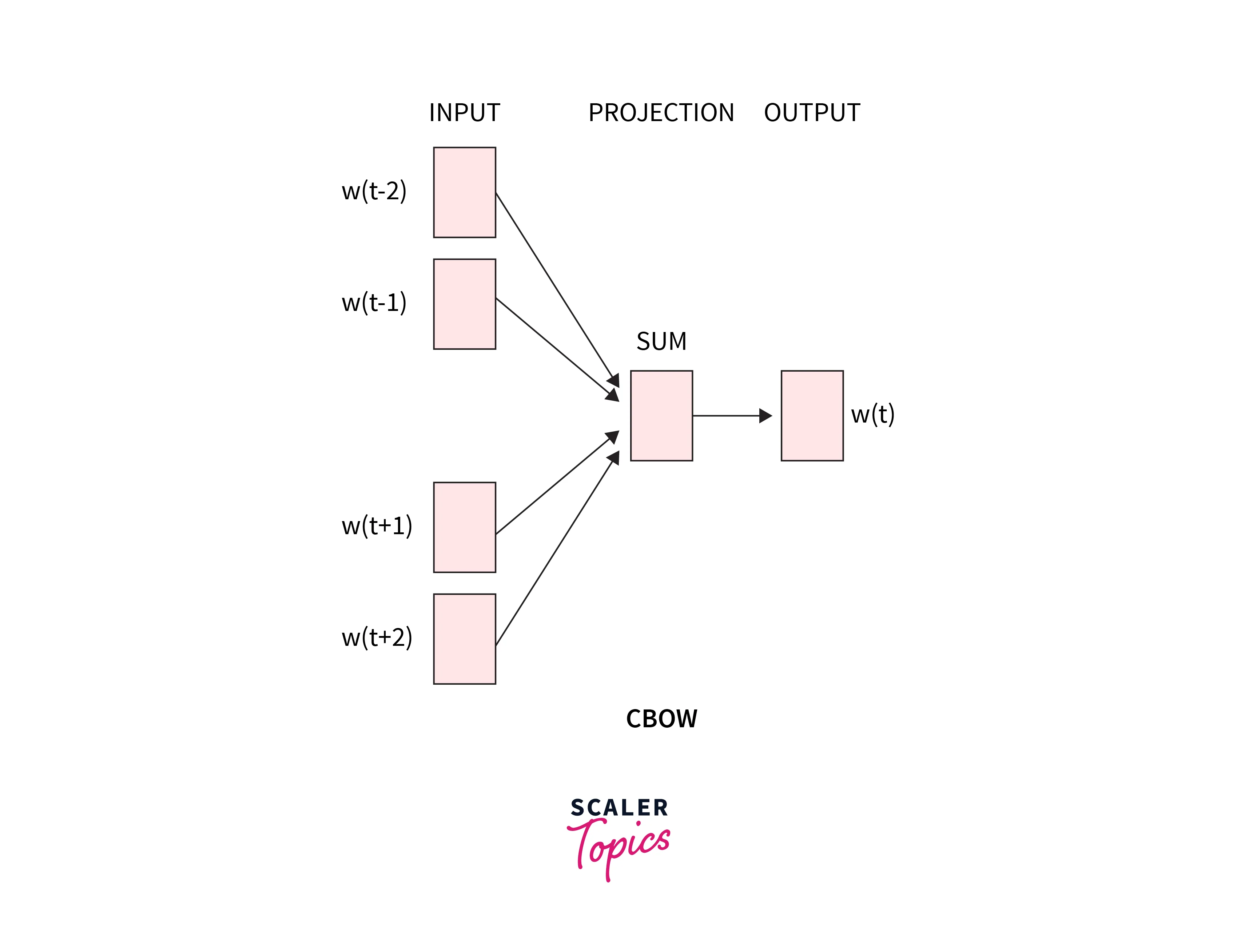 Four 1XW input vectors will make up the input layer if four context words are utilized to forecast one target word. The hidden layer will receive these input vectors and multiply them by a WXN matrix. The 1XN output from the hidden layer finally enters the sum layer, where the vectors are element-wise summed before a final activation is carried out and the output is obtained.