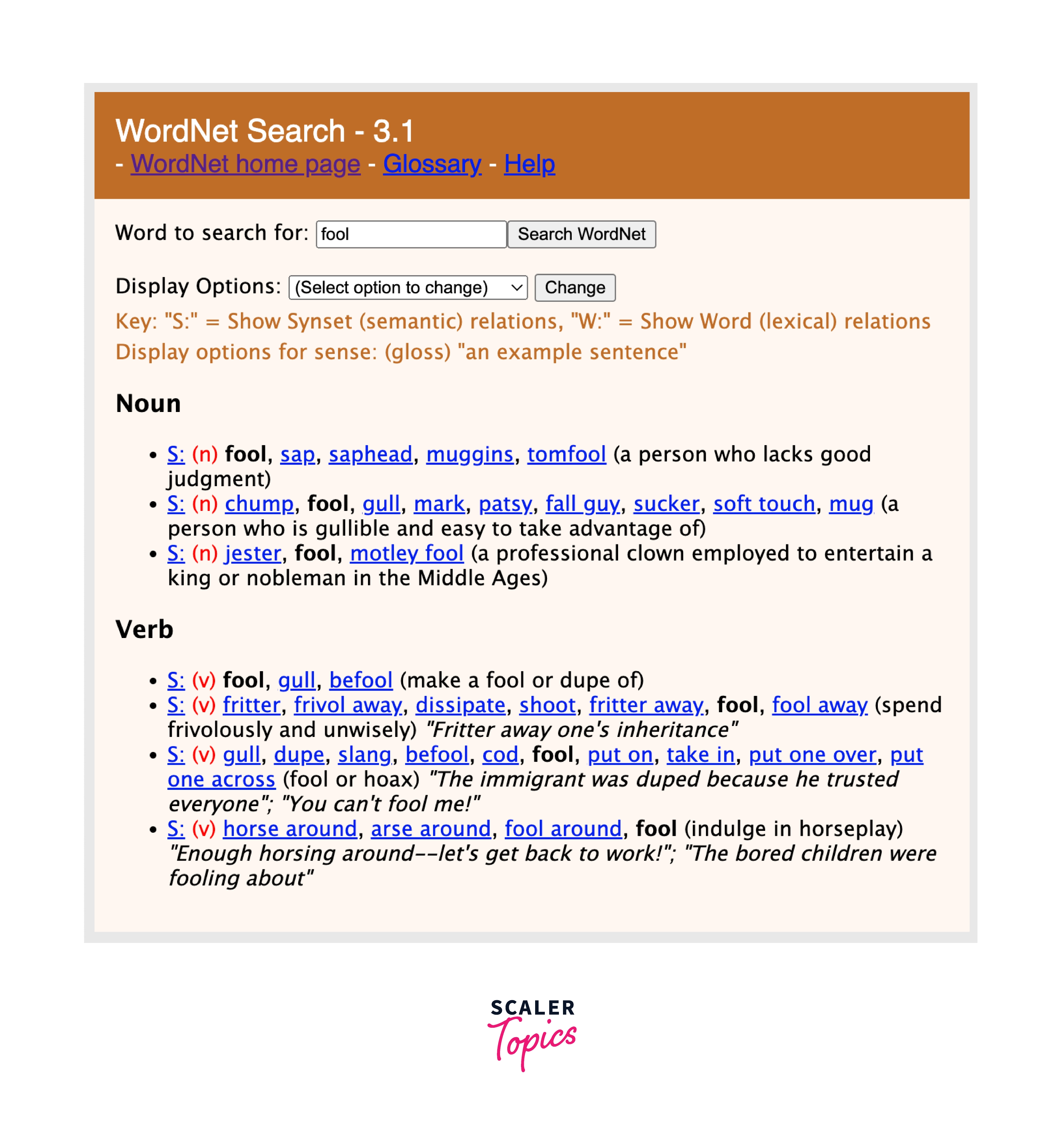 Now that we have discussed some NLP terms, let's get back to WordNet. WordNet is a large lexical database of words, senses, and their semantic relations. This project was started by George A. Miller in the mid-1980s, and captures the word and their senses. In WordNet, the sense is defined by a set of synonyms, called synsets, that have a similar meaning or sense. This means WordNet represents words (or senses) as lists of the word senses that can be used to express the concept. Here is an example of a synset. Sense for the word 'fool' can be defined by the list of synonyms as {chump, jester, gull, fritter, dupe, fool around}