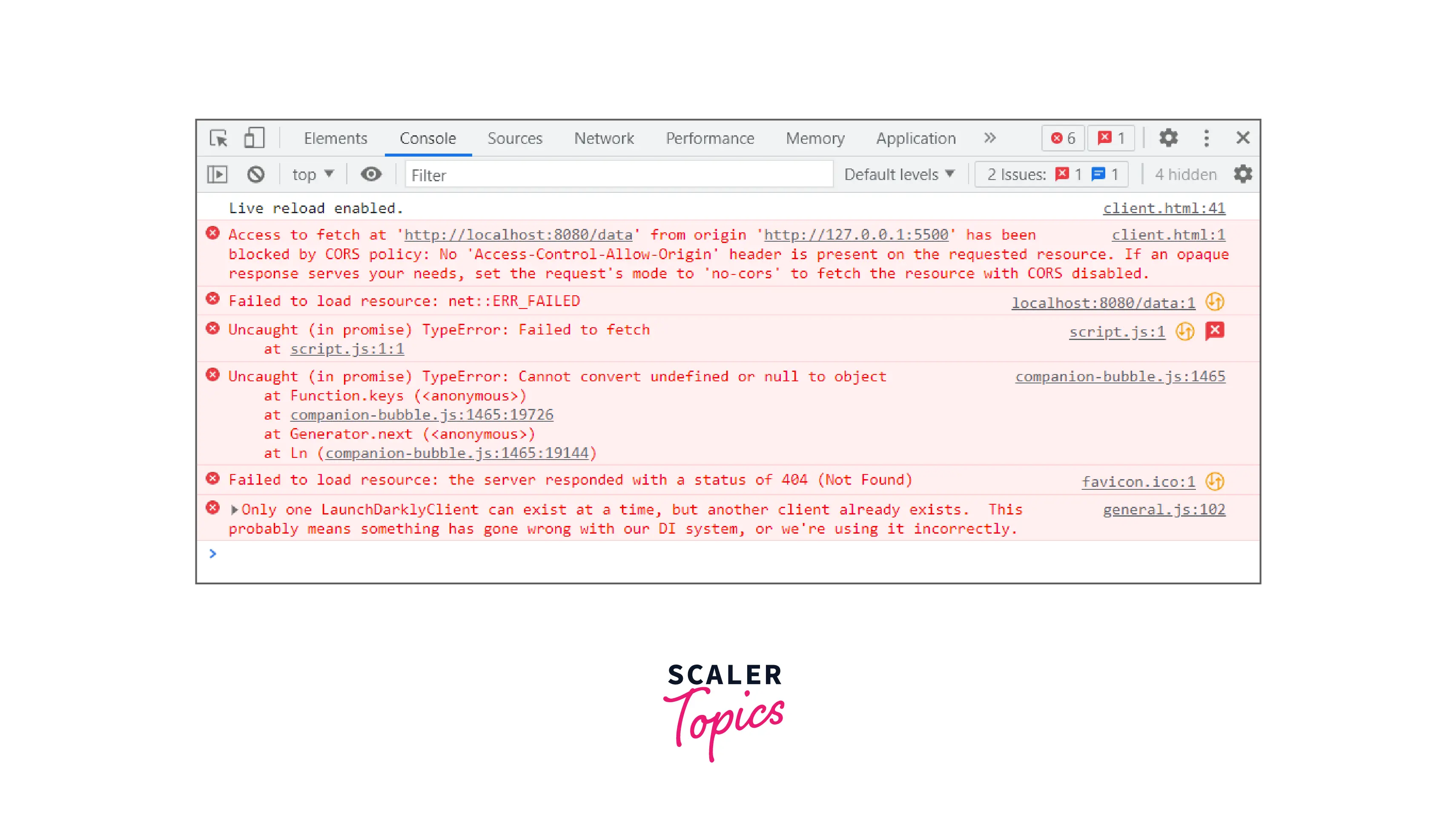 Now, Visit the HTML page in the browser and open the console. We can right-click on the browser window and select Inspect. Then we move to the Console panel. Here we would see the CORS error.