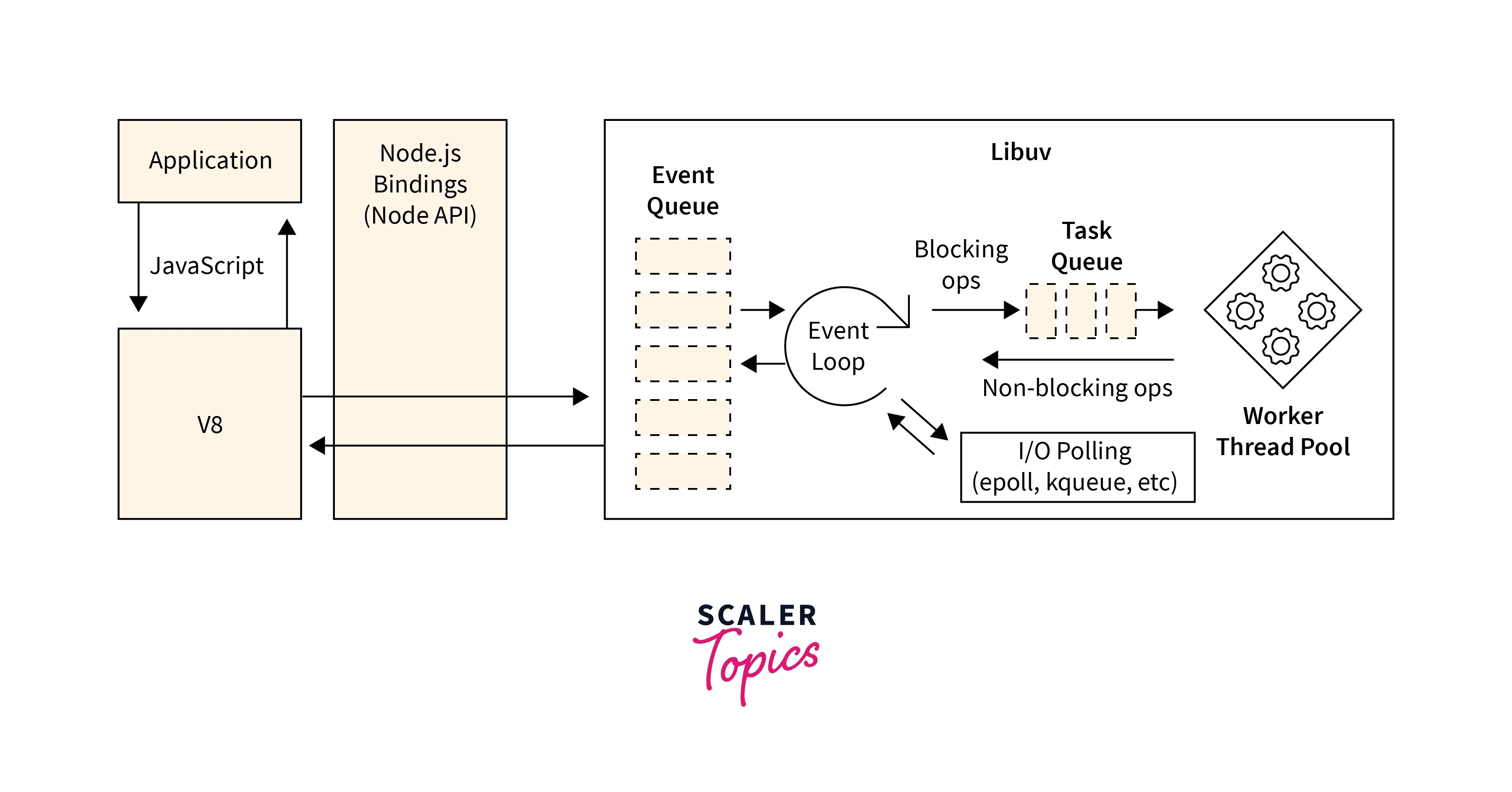 Thus Node.js holds the two libraries (V8 and Libuv) together; thereby, it becomes a unique interface and solution for developers. Hence can write your whole code in Javascript and compile it efficiently without interacting with C++ code directly.