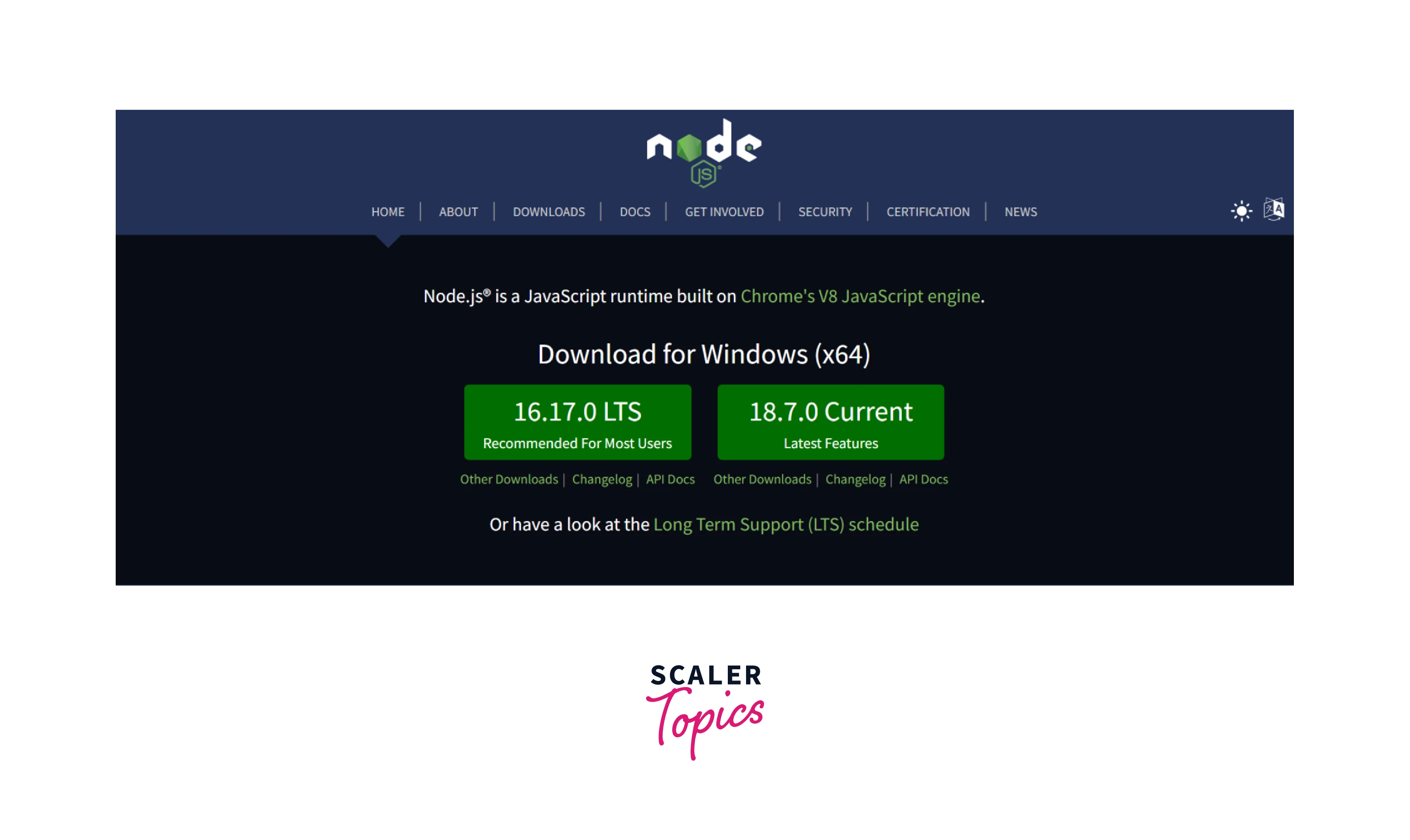 It is the easiest way of installing Node.js. Visit the official Node.js website. There are two kinds of builds available on the website: LTS(long-term support) which is recommended and Current which contains the latest features. The LTS releases are highly refined and bug-free. The Current builds contain the new features, but they may not be complete. Hence it is recommended to use LTS builds. The steps to install Node.js on Windows are as follows: