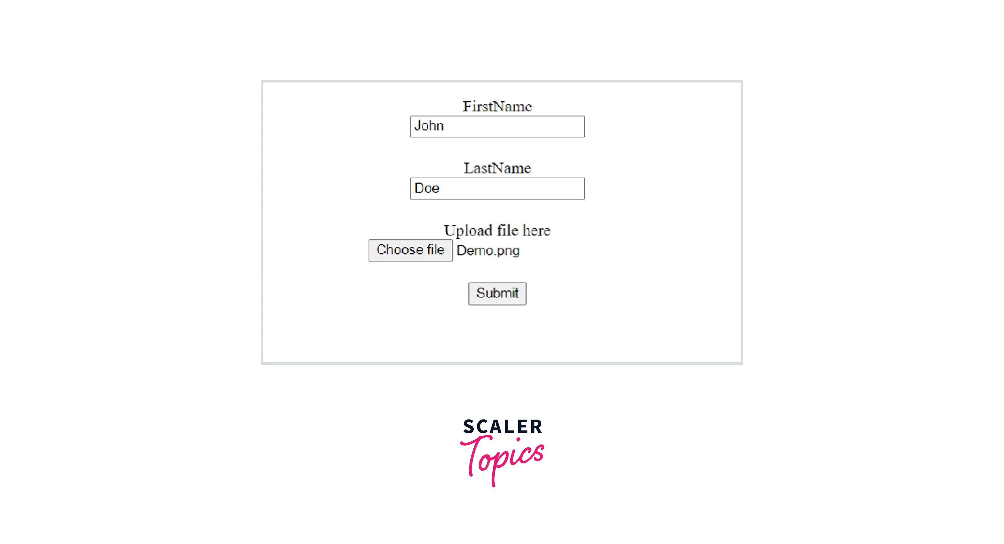 In the above code, a form tag is used, and the enctype attribute has been set tomultipart/form-data. The form has input tags to create text input fields for firstName and lastName, and a file input to support file upload. The form currently has the action attribute as http://localhost:3000/upload and the method as POST. The url of the API that we will be creating in Node.js is specified in the action attribute.
