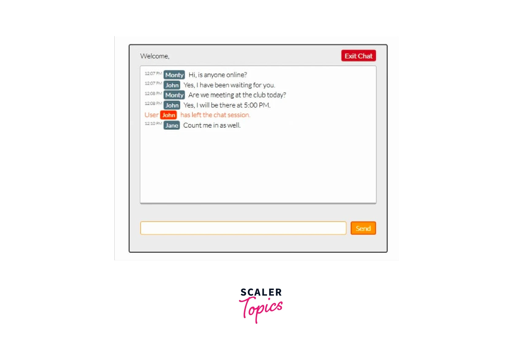 We can make real-time chat node js projects for beginners using WebSockets. For this, we can install a very popular NPM package - Socket.io. Sockets allow client-servers to have bi-directional communication in real-time which will enable a chatroom experience. The number of users can be more than two and using a simple HTML Form and JavaScript events, we can make the front-end display the messages from the users.