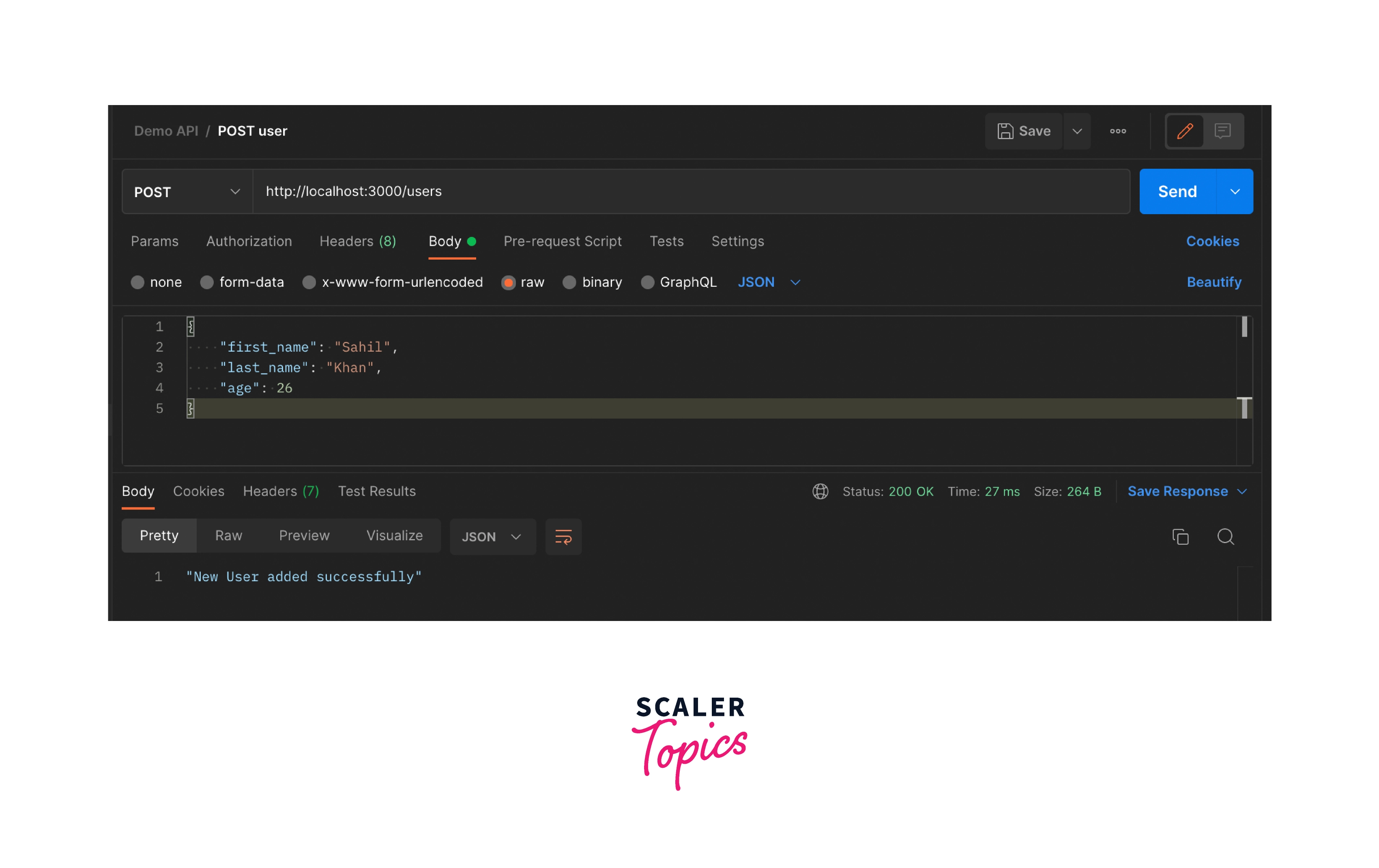 For testing the POST API, make sure to add the user details in the request body. To add user data, go to the Body section, select raw data, select JSON as the data type, and add the JSON object in the textbox as shown below: