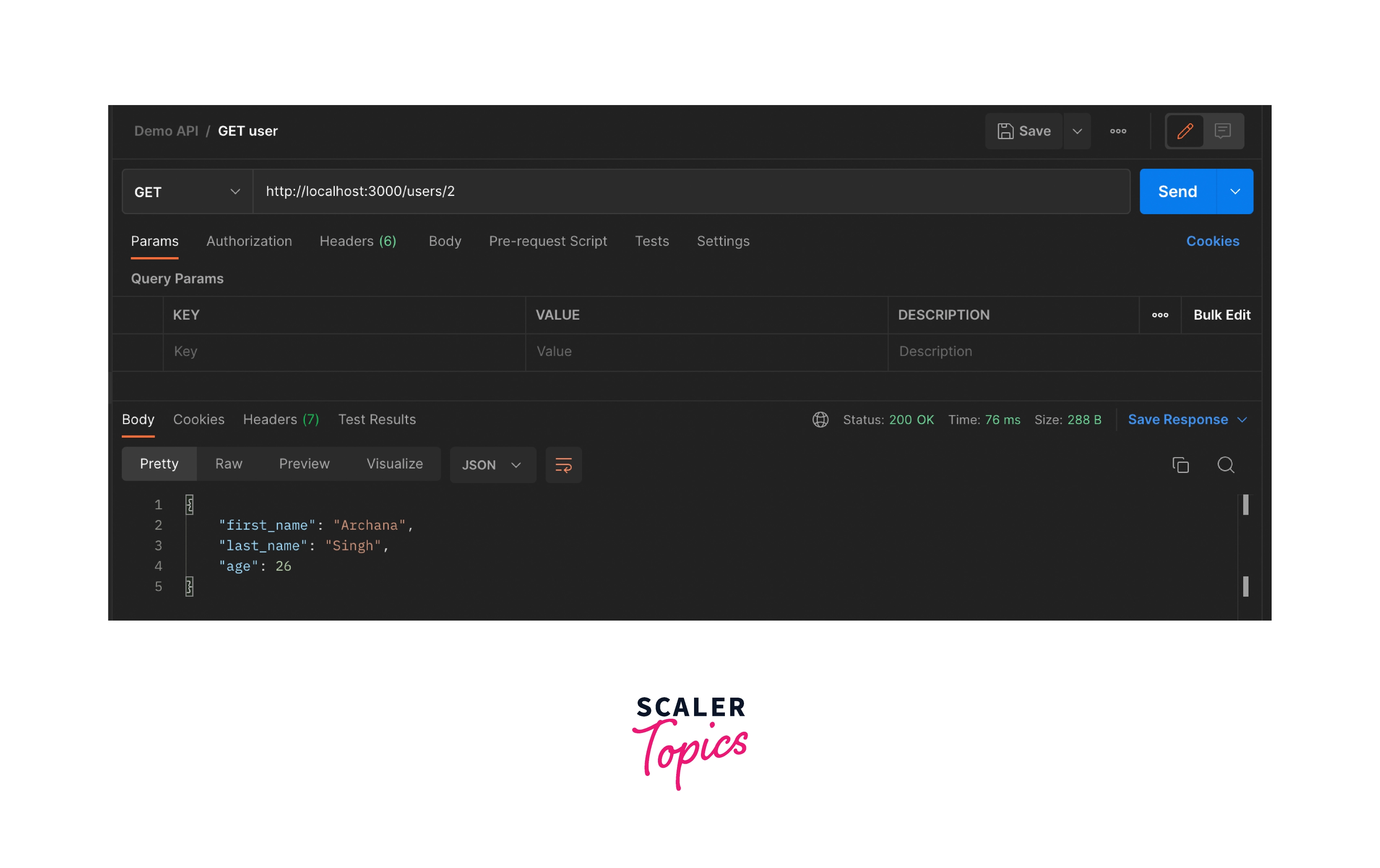 Here, req and res stand for the request and response objects respectively. So, to retrieve data of all the users, we can write a GET request as shown below: