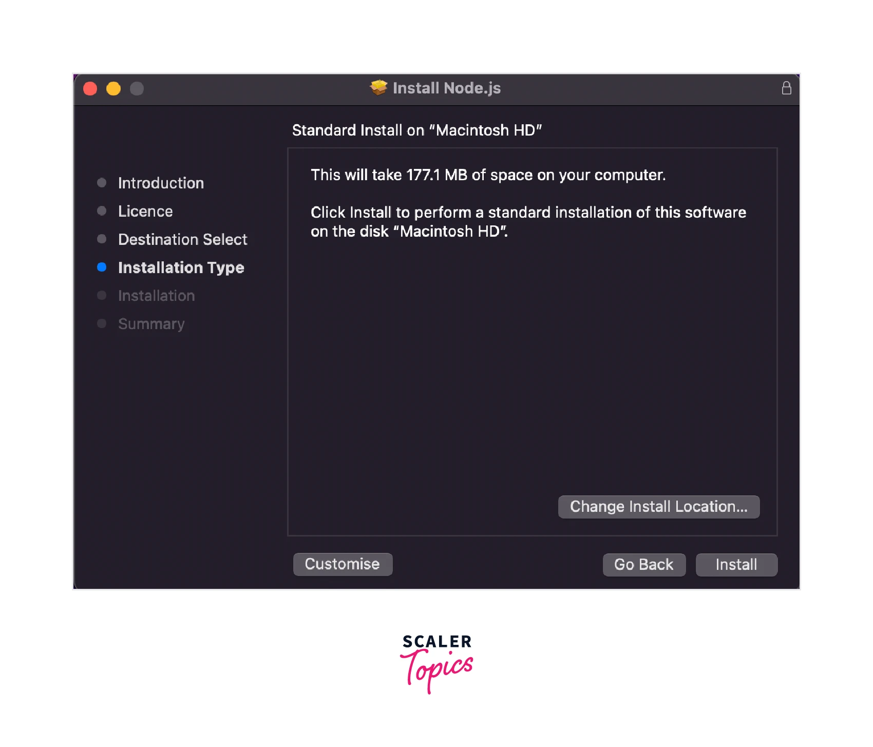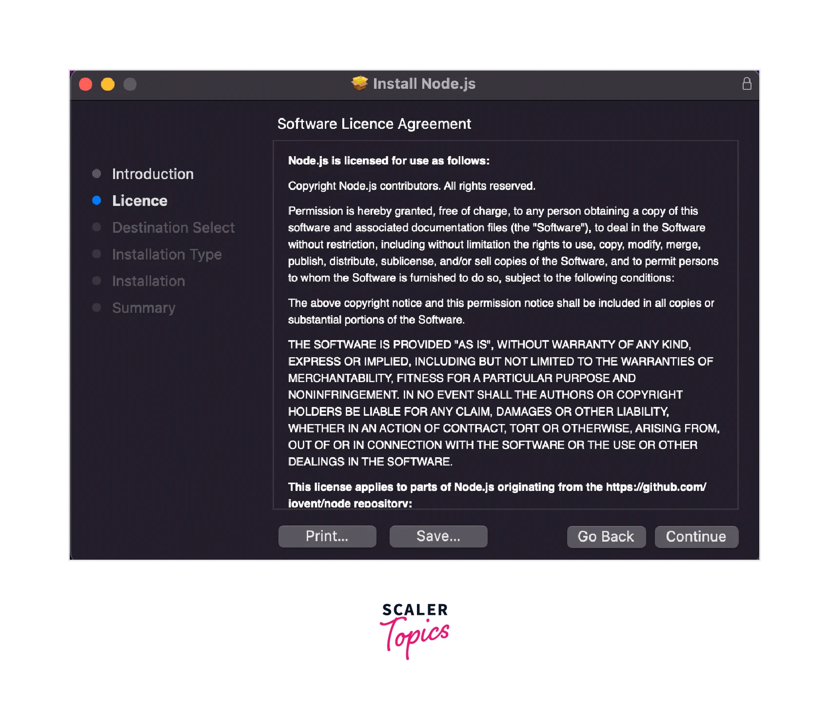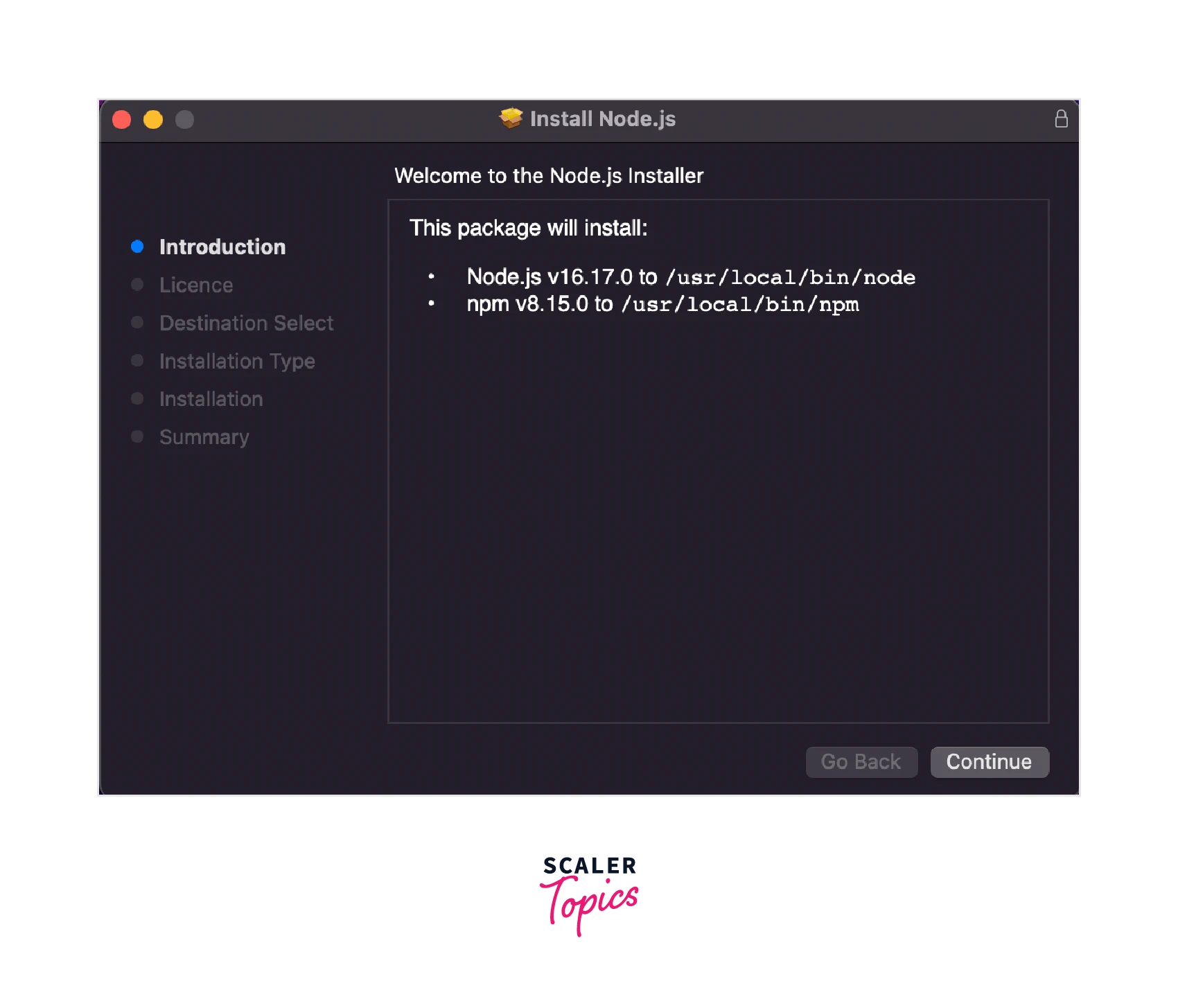 Locate and open the NodeJS installer on your computer. You’d see the version and location of the directory where NodeJS and NPM will be installed. Click on Continue