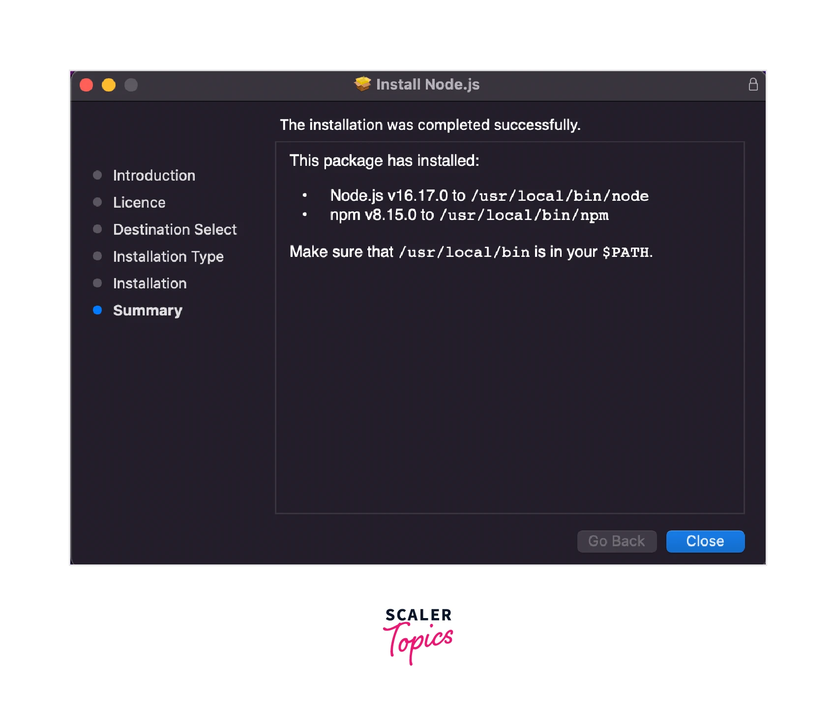 With this, Node and NPM are successfully installed on your system. Now, you can close the installer.