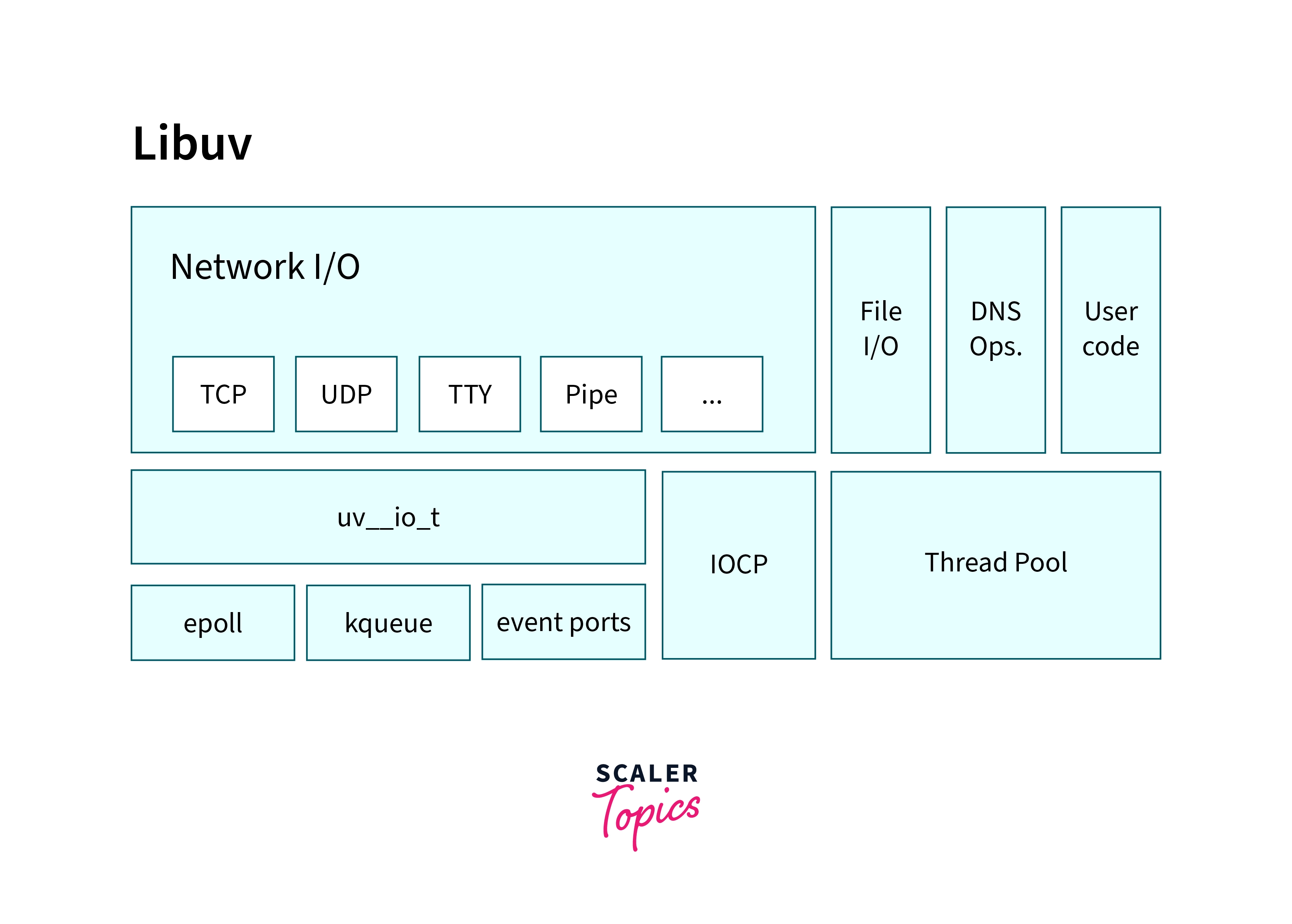 - Other features of libuv include Asynchronous DNS resolution, Asynchronous file and file system operations, IPC with socket sharing, using Unix domain sockets or named pipes (Windows), Signal handling, high-resolution clock and Asynchronous TCP and UDP sockets.