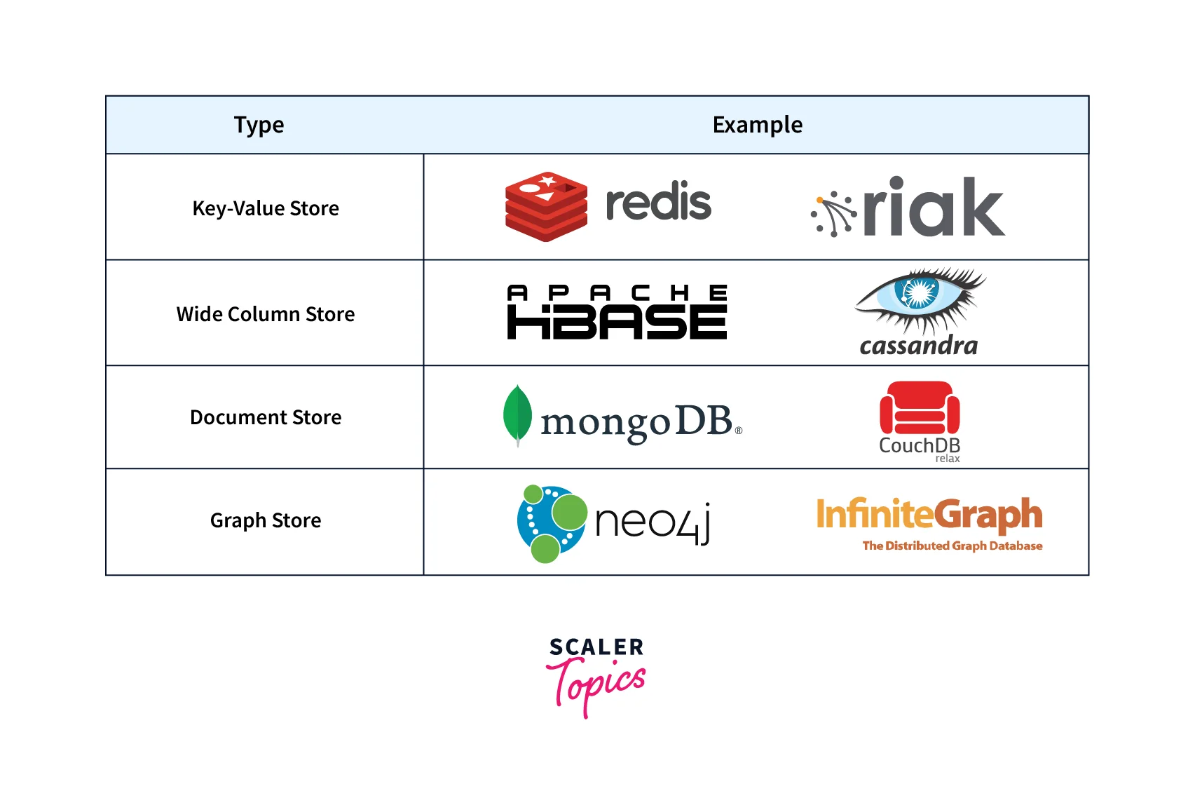 - Wide-column store: Allows for dynamic columns and stores data as columns rather than rows. HBase and Apache Cassandra are two common examples.