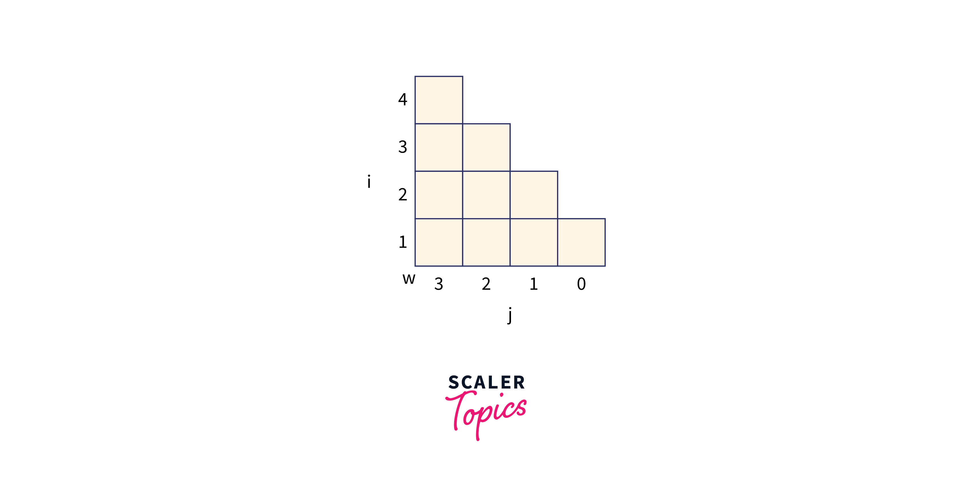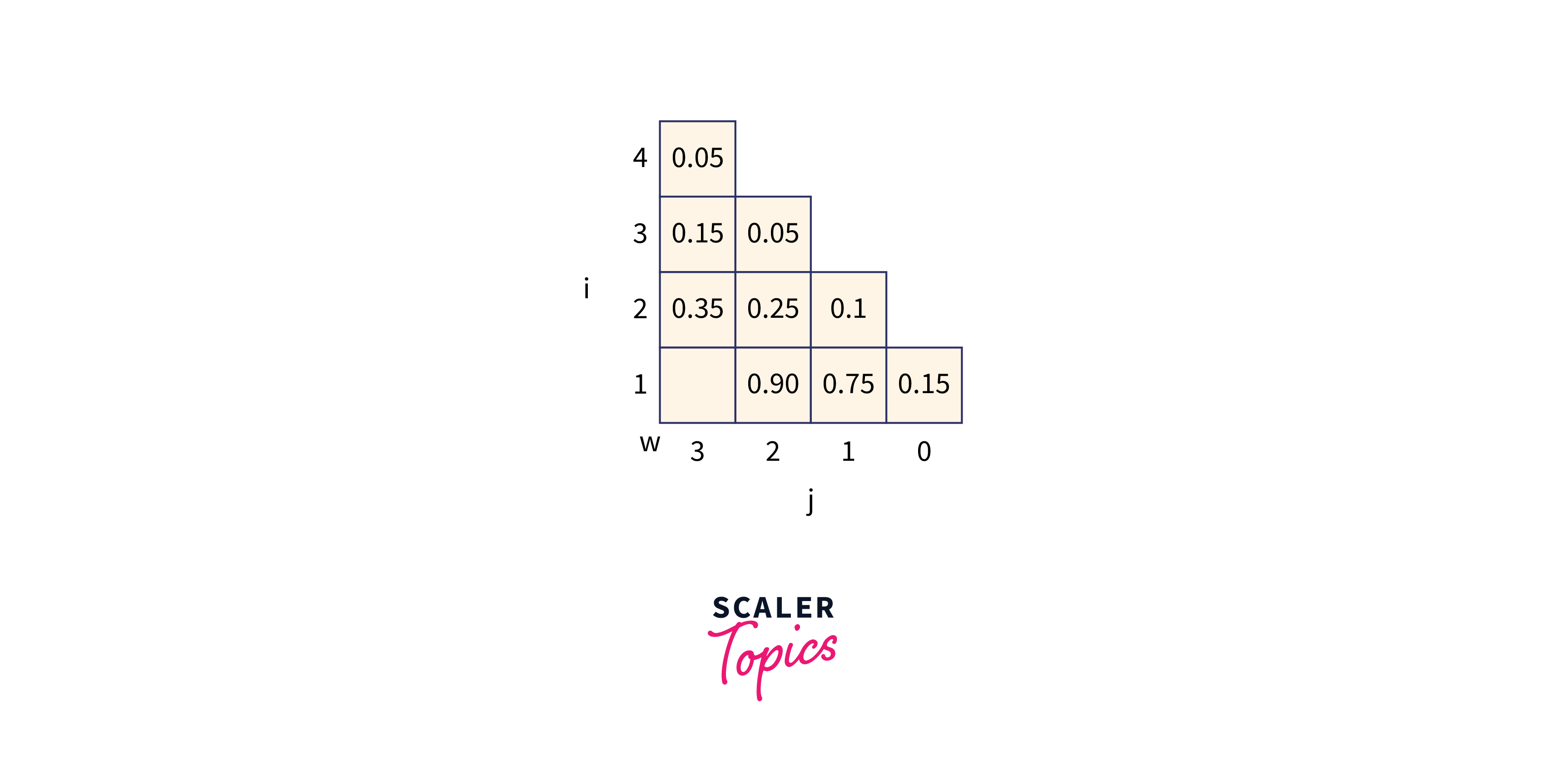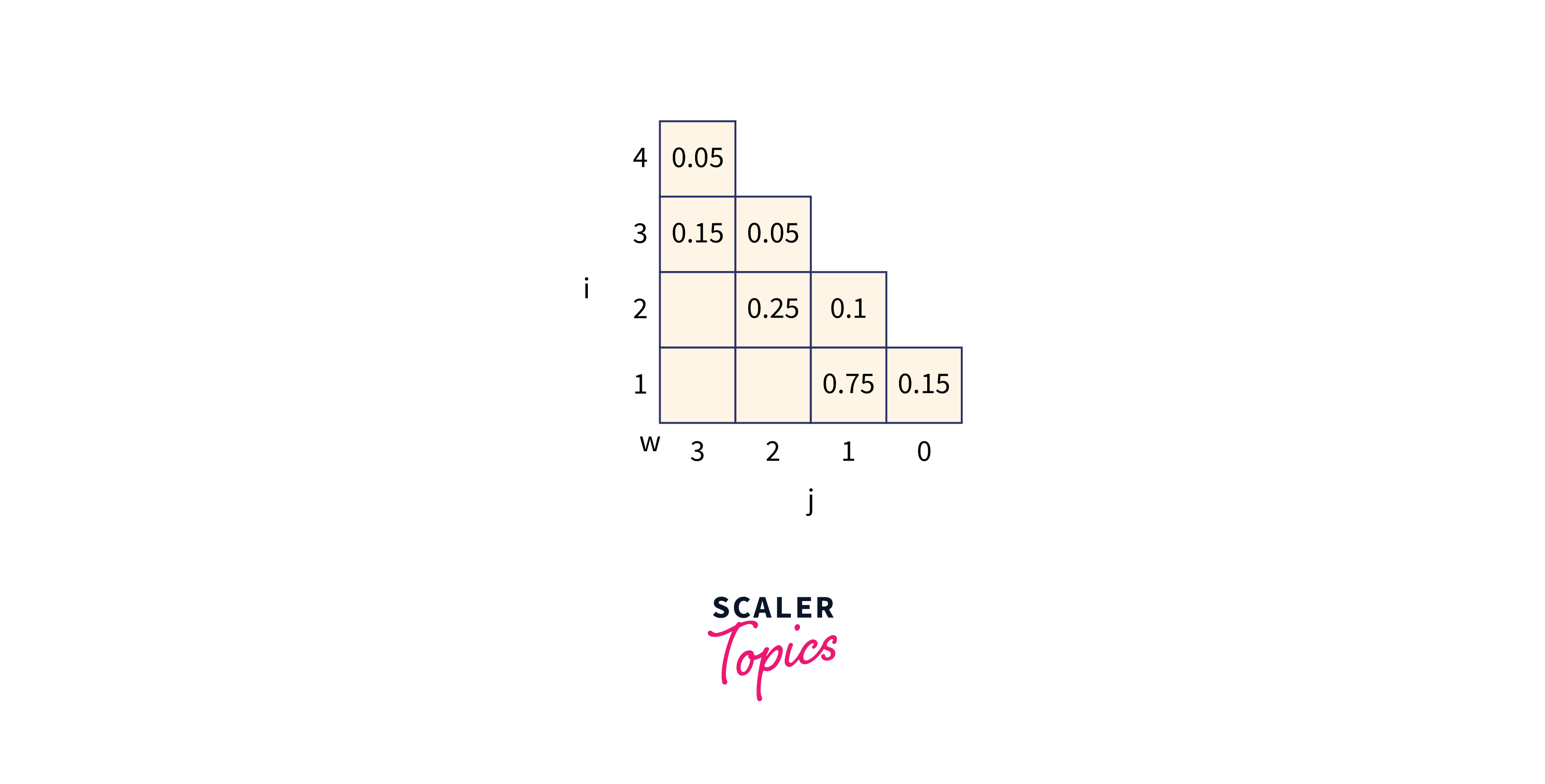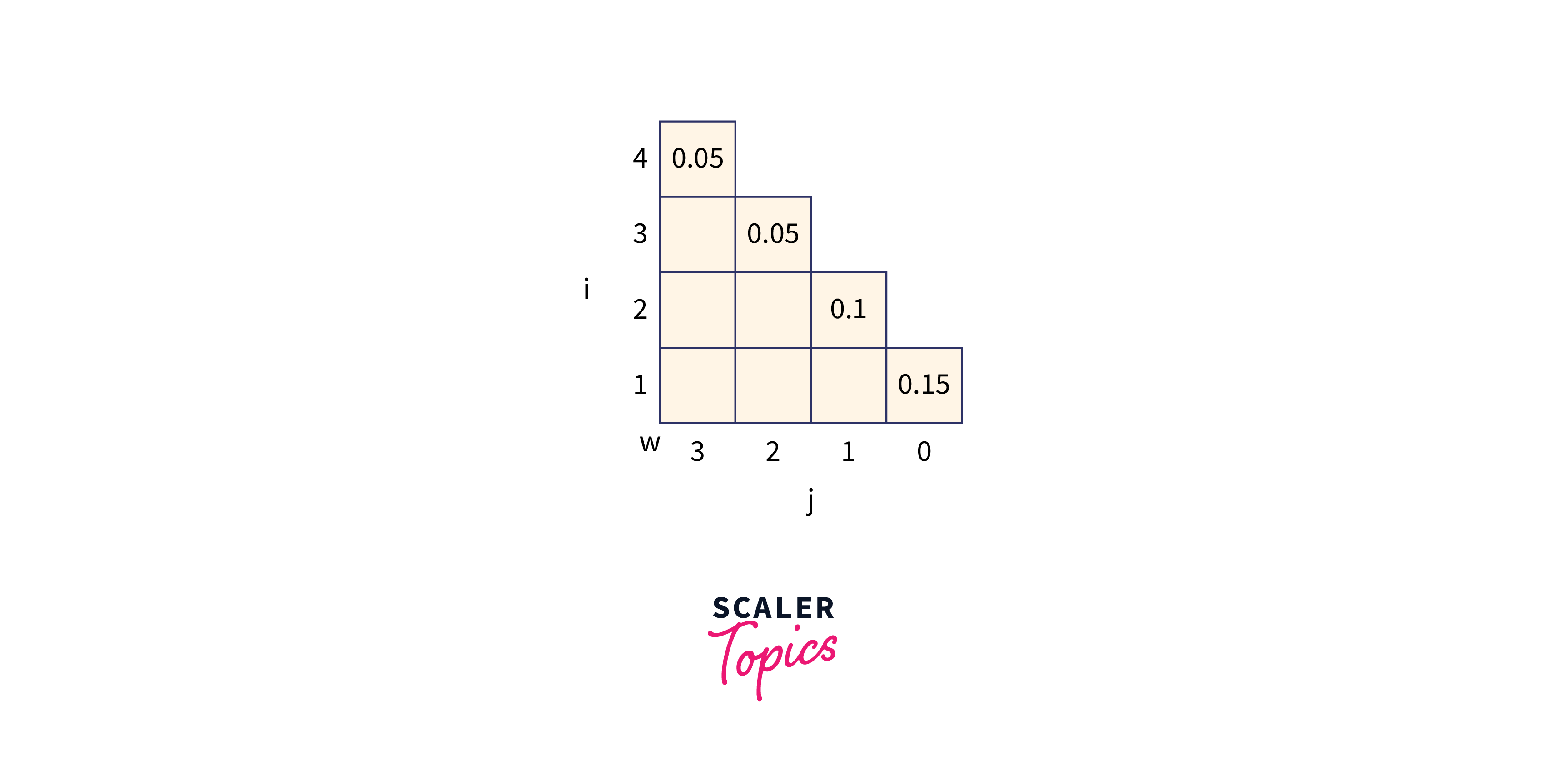 We use an auxiliary array cost[n][n] to store the solutions of subproblems. cost[0][n-1] will hold the final result. The challenge is that all diagonal values must be filled first, then the values that lie on the line just above the diagonal. Or in a simple way, we need to first fill in all the cost[i][i] values, then all the cost[i][i+1] values, and finally all the cost[i][i+2] values.