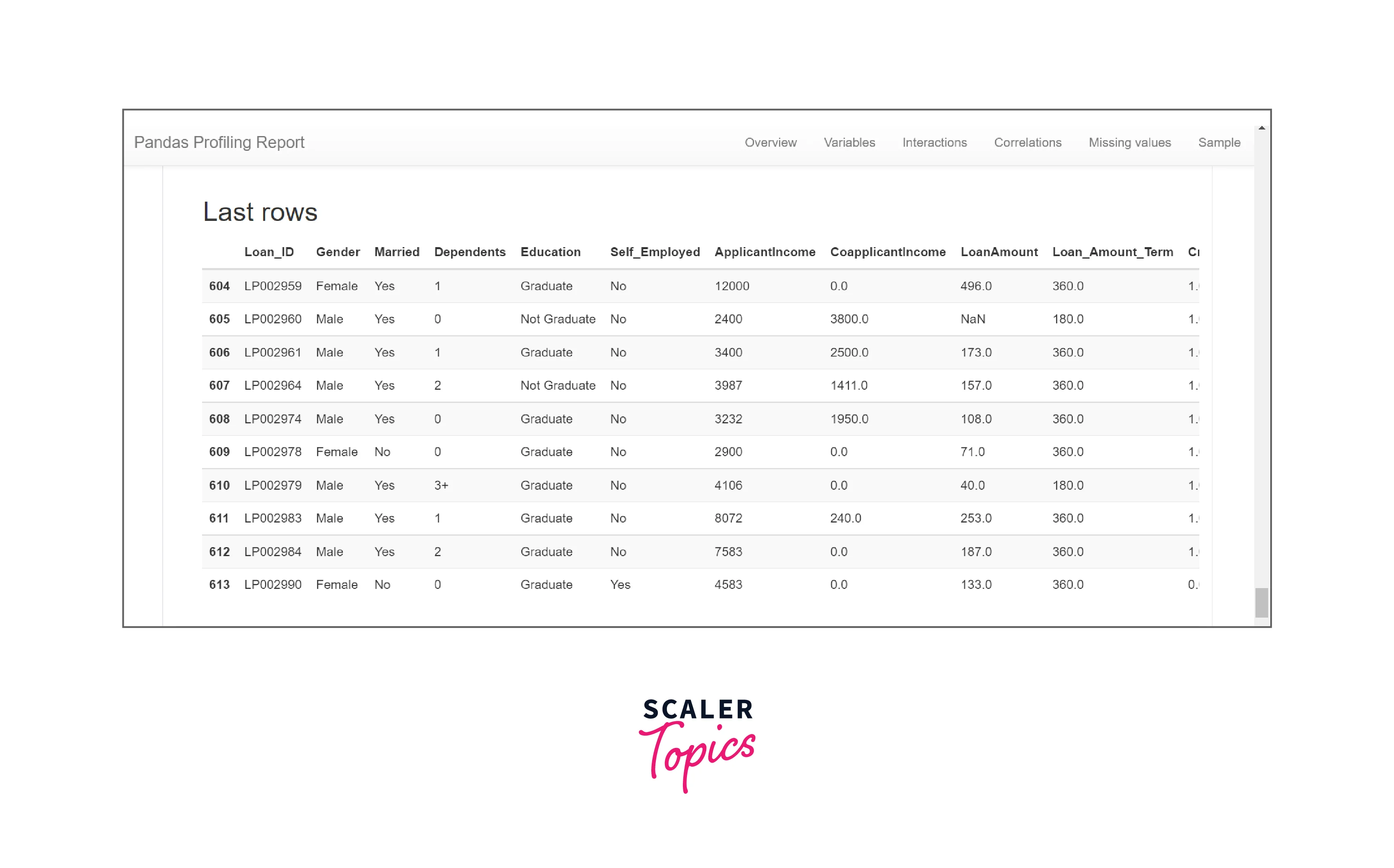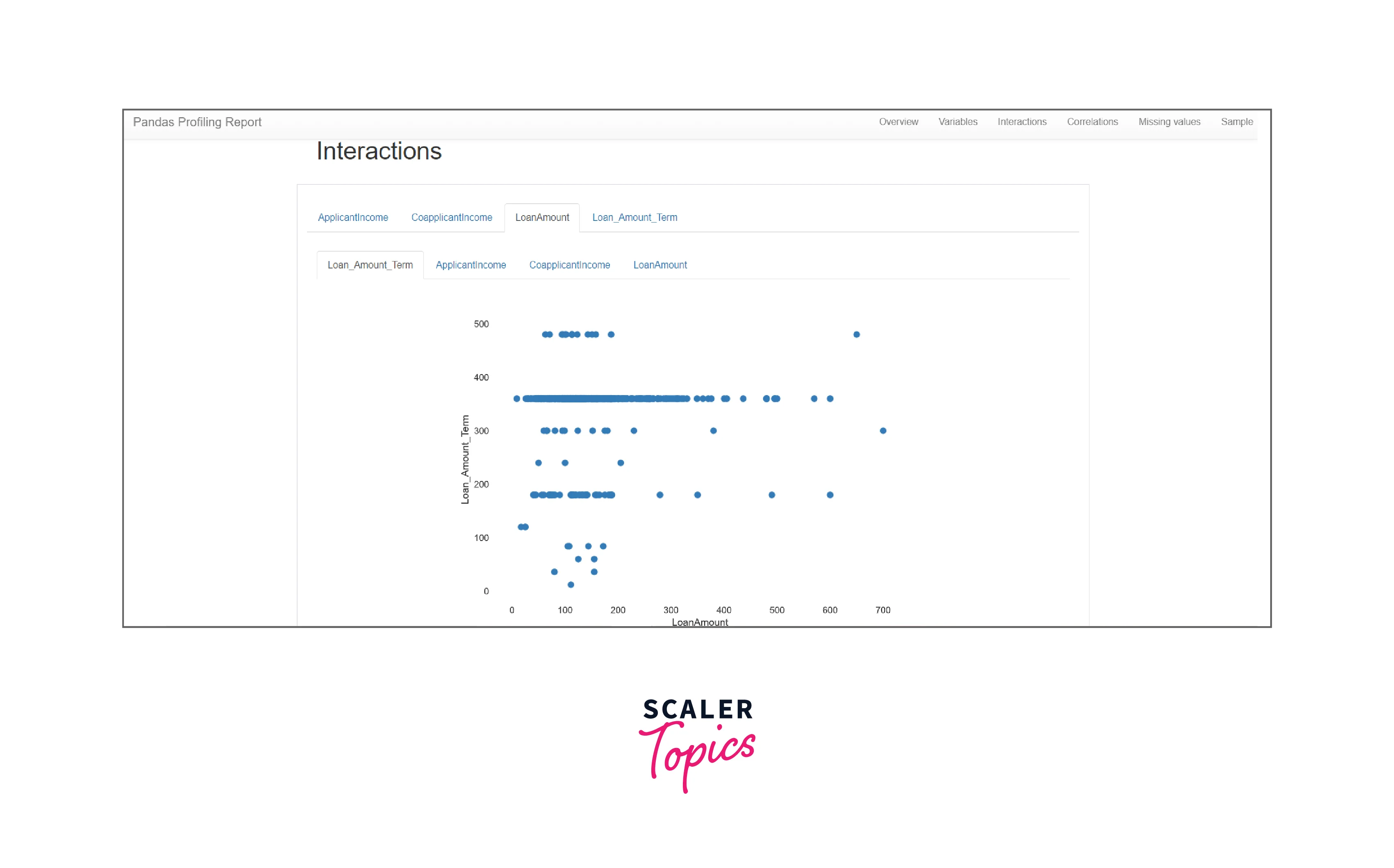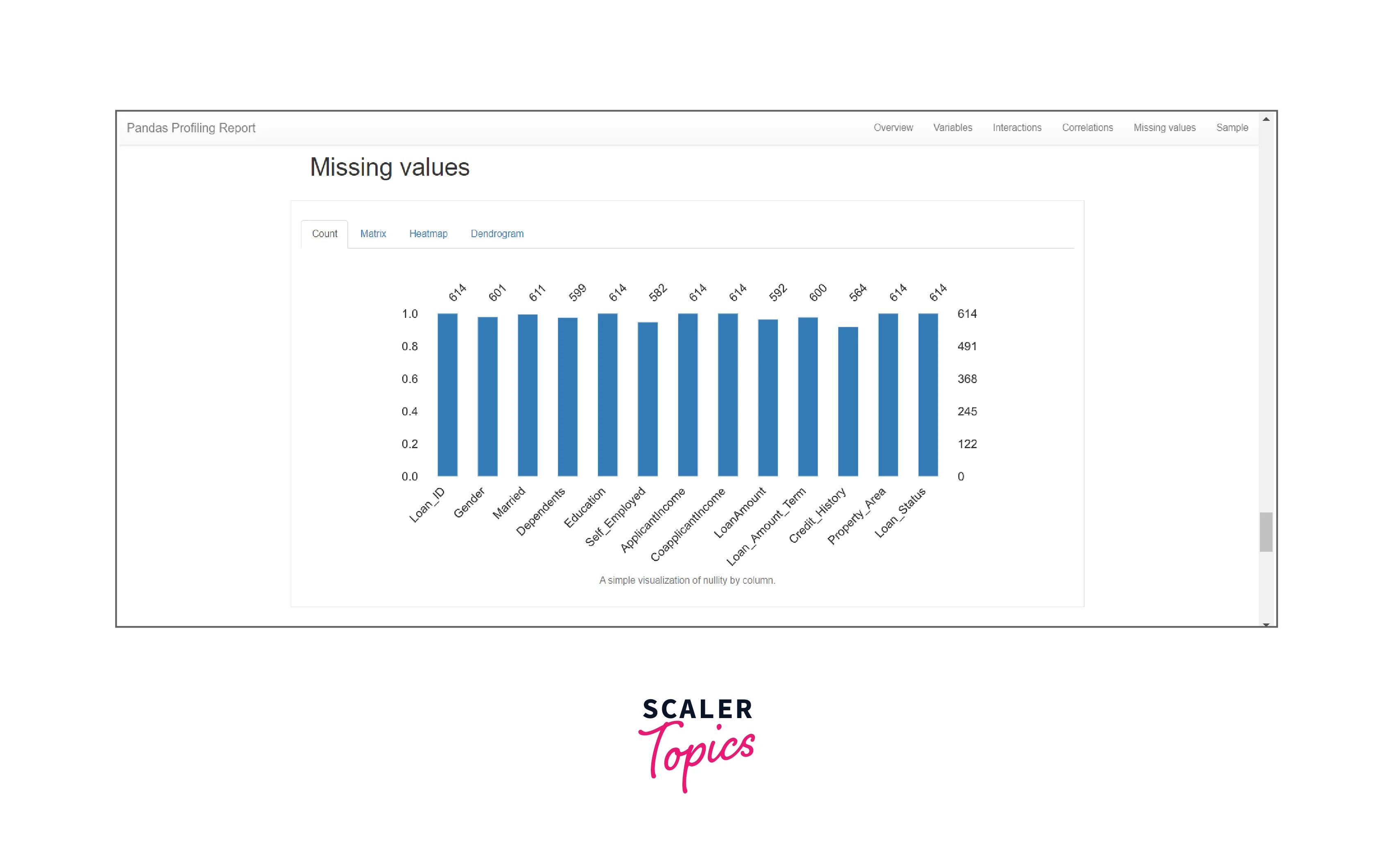 The above-mentioned three sections are all covered under the overview and provide maximum details about the dataset. But there are other sections we need to look at such as Variables, Interactions, Correlations, Missing values, and samples.