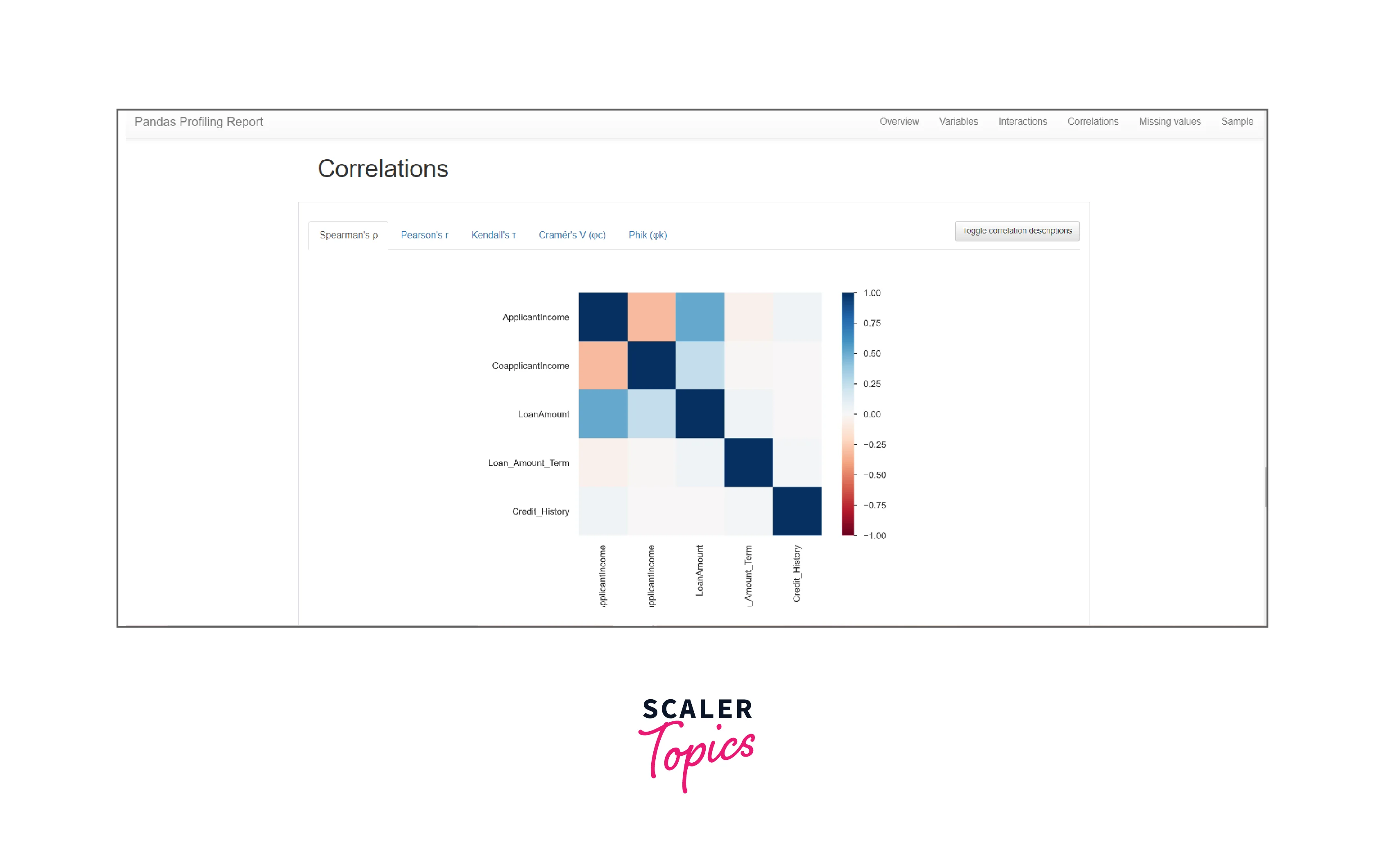 • Correlations: It shows high correlation warnings that are based on different correlation metrics (Spearman, Pearson, Kendall, Cramér’s V, Phik, Auto) in the form of a colored square-like graph.