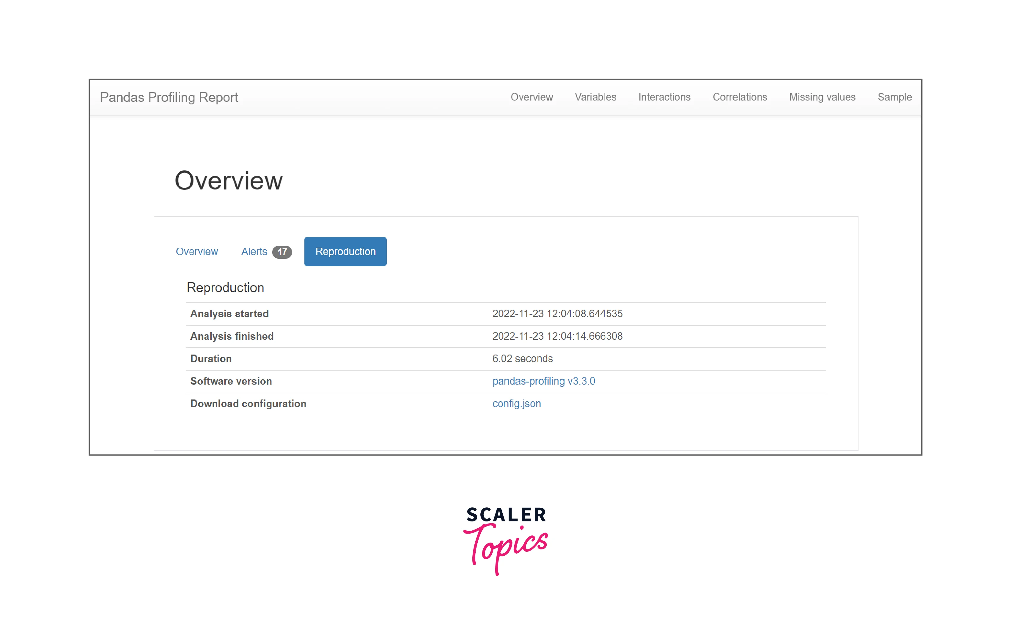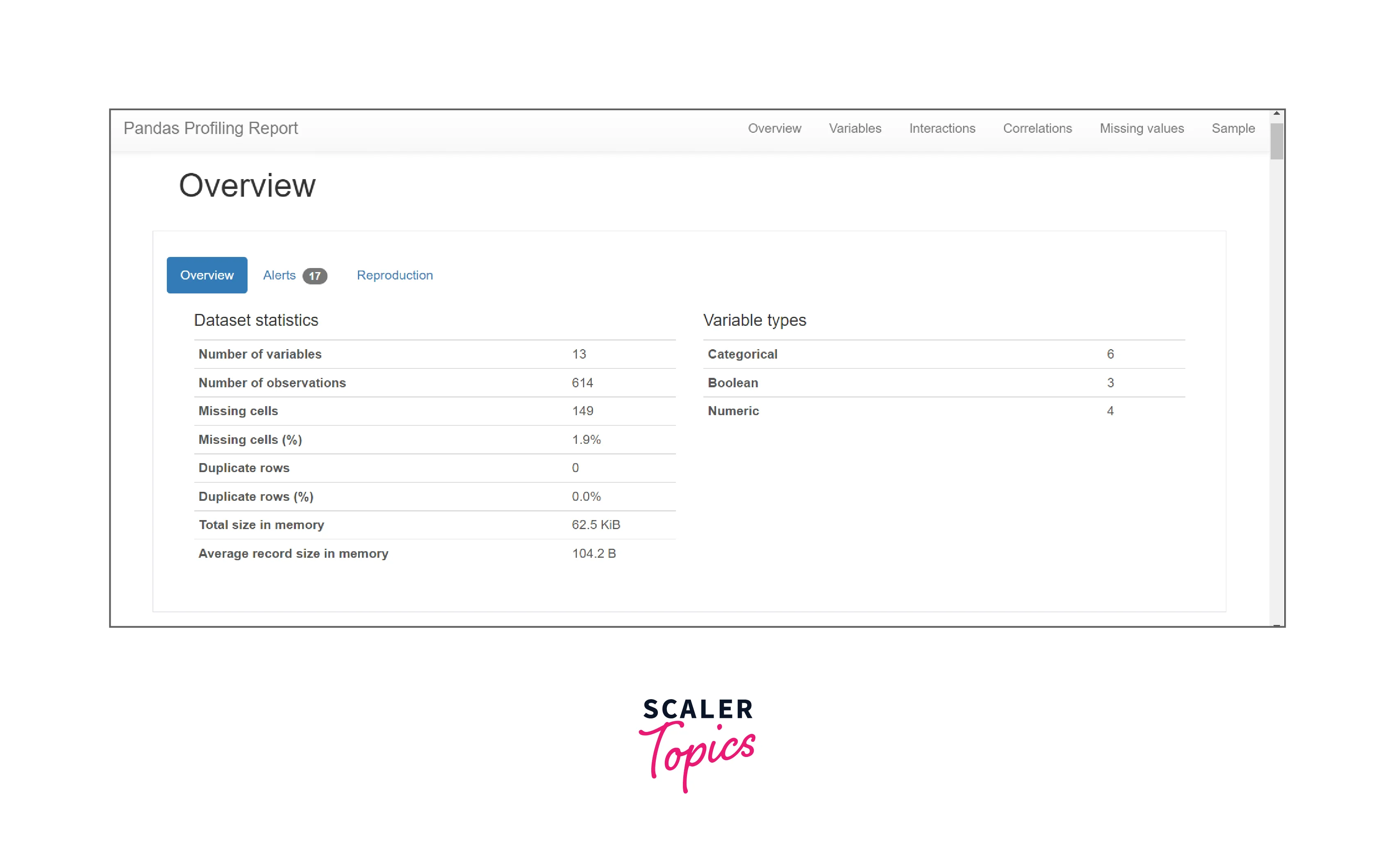 • The report contains three major sections, Overview gives us an overall idea about the missing values, the duplicate rows, the total number of observations, etc. Alerts section gives us an idea about the possible issues or warnings existing in the dataset is its high cardinality, missing values, number of zeroes, etc. Reproduction gives us an idea in terms of technical aspects of the report such as analysis start and end time, the total duration of analysis, the version, etc.
