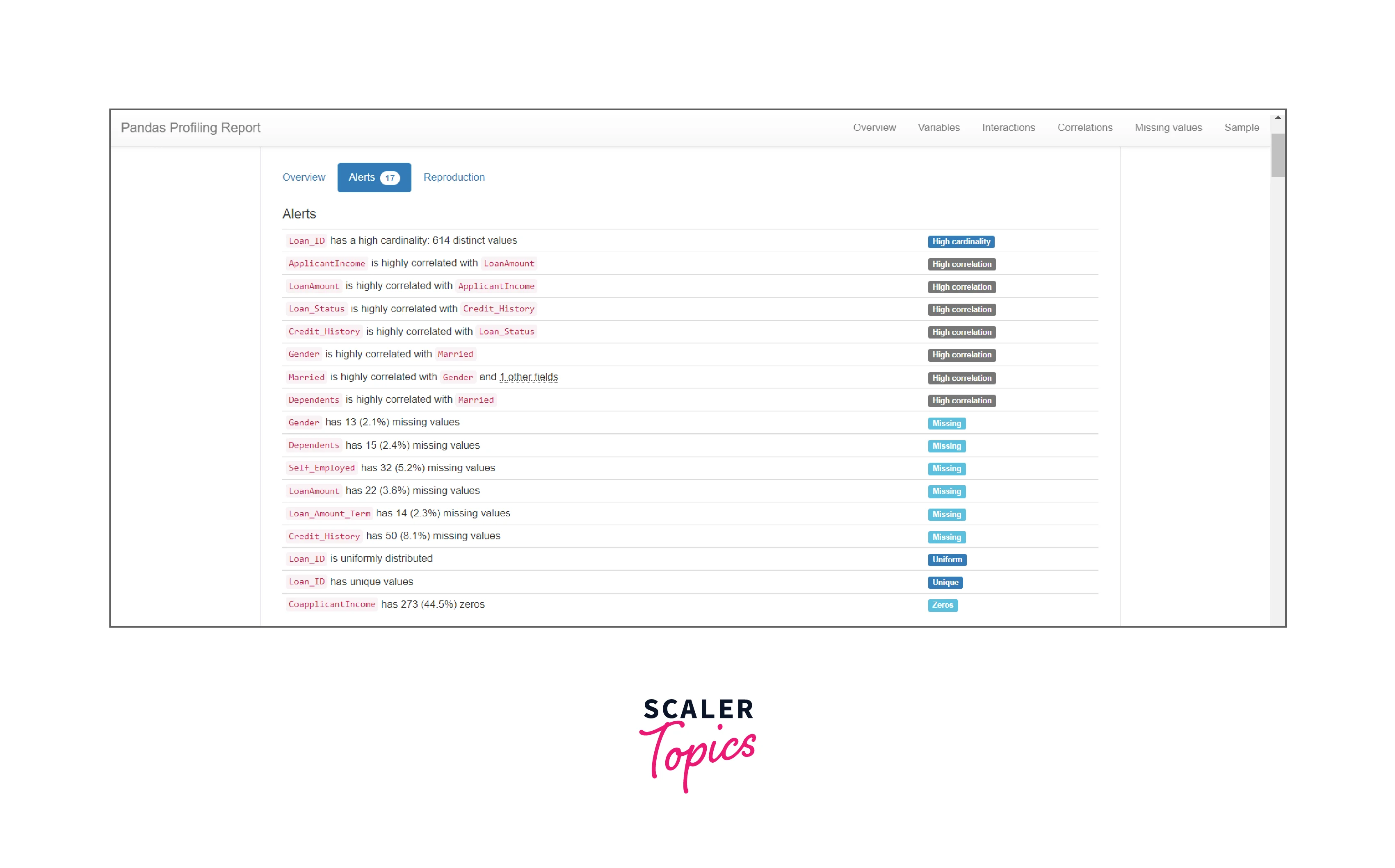 • Alerts: Under the alerts tab within the Overview section, we can find collated warnings for any of the variables within the dataset. It is nothing but a comprehensive list of potential data quality issues such as high correlation, high cardinality, skewness, uniformity, zeros, missing values, etc. Alerts