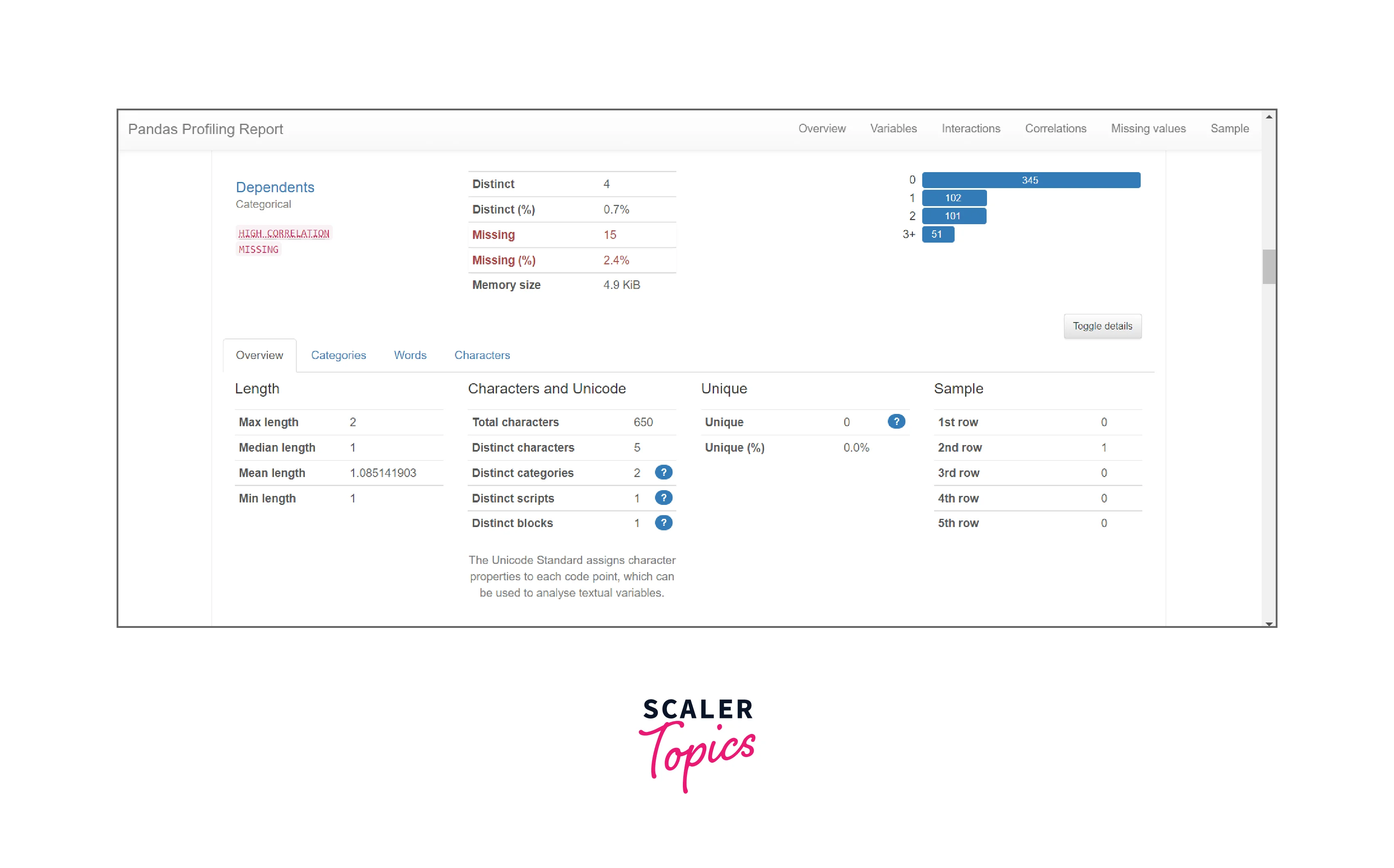 • In the end we looked into some other sections such as variables, interaction and correlation, missing values, and samples. The variable section gave us an overview of the types of variables and their frequency charts. The interaction and correlation showed the dependency between the variables as pairs. The missing value represented all missing values in the dataset in four different forms. The sample section gave us an overview of the dataset by returning the first and last ten rows of the dataset.