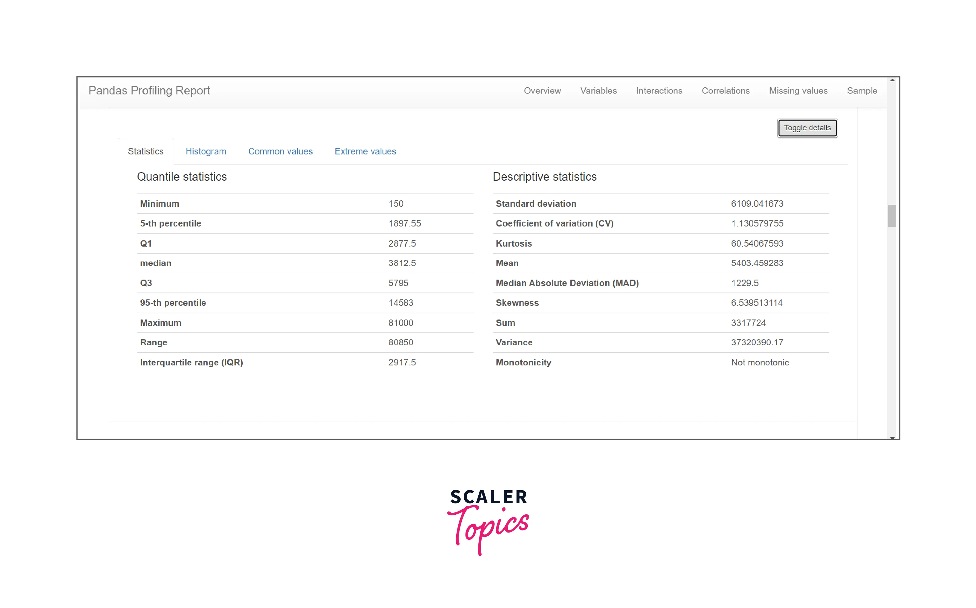 • The profiling of numerical data type is way more detailed in comparison to any other data type. It divides the report into two segments Quantile statistics and Descriptive statistics.