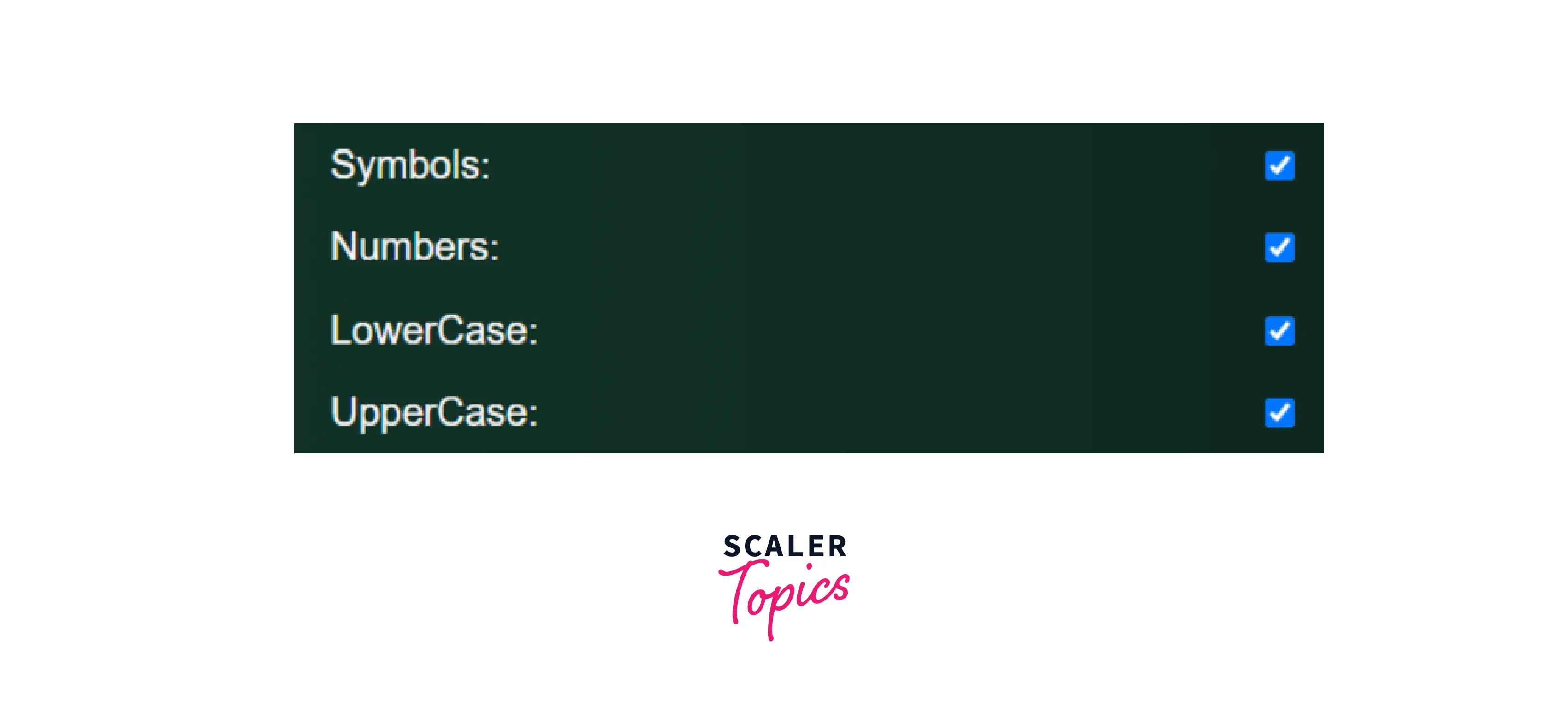 However, it is mandatory to keep at least one of these checkboxes checked, or else there won't be any character to include in the password. We'll alert the user if all the checkboxes are unchecked while writing the JavaScript code.