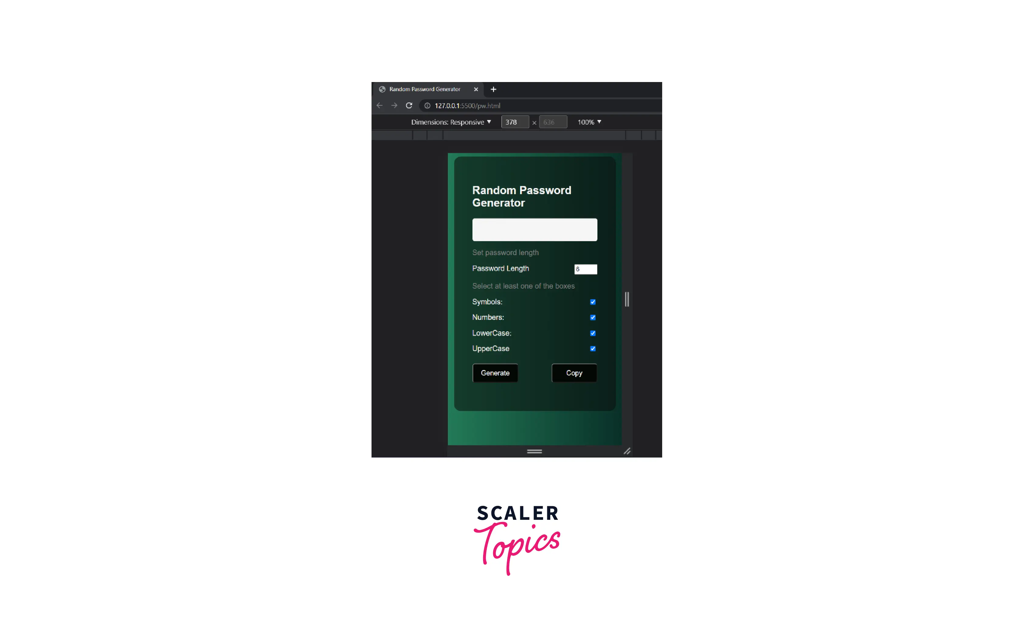 Now, the password generator looks impressive. However, we also have to make it responsive so that it adjusts itself according to the changing size of the viewport. We need to use media queries to define what happens when the width shrinks down. The respective elements will have to reduce their size accordingly.