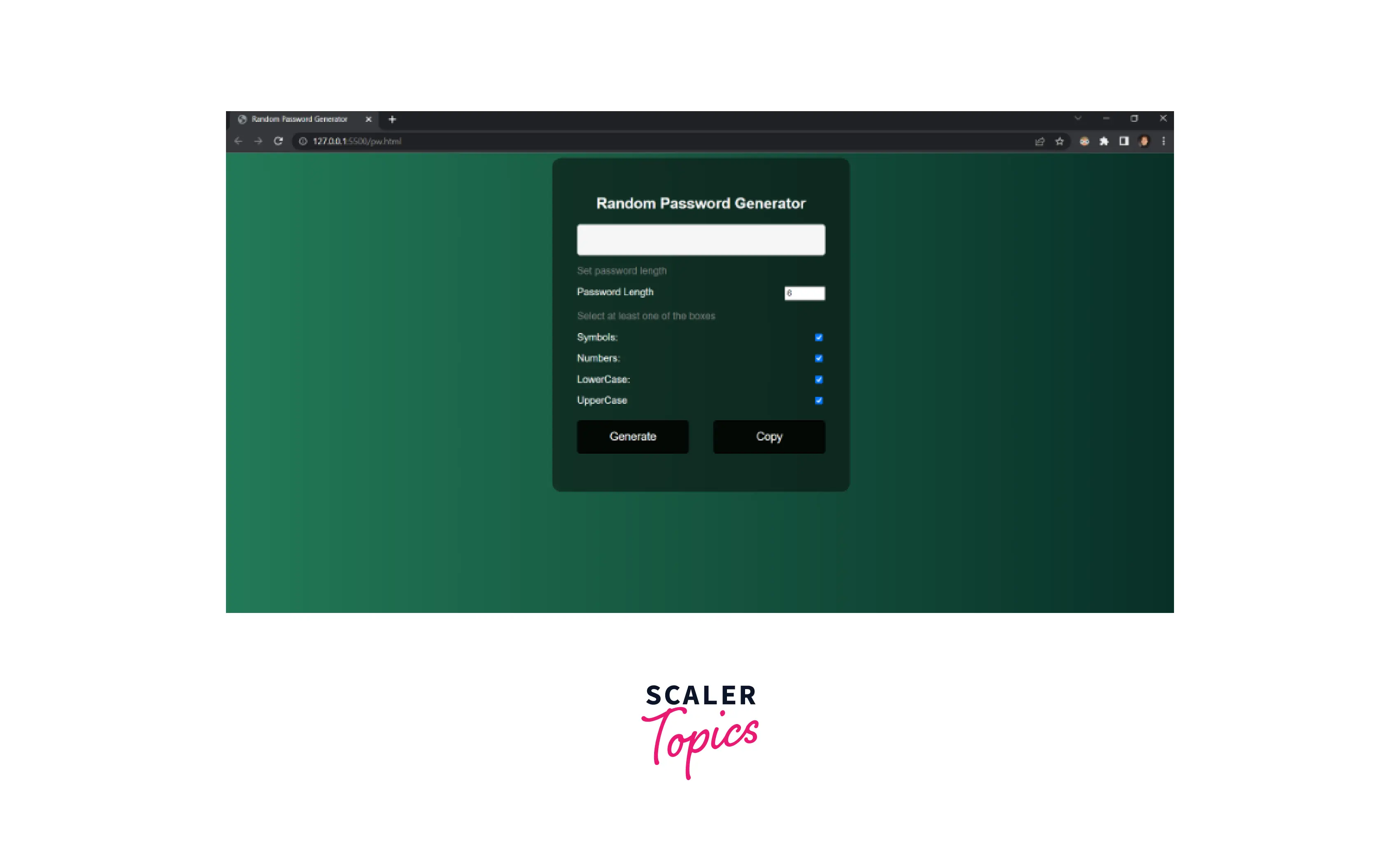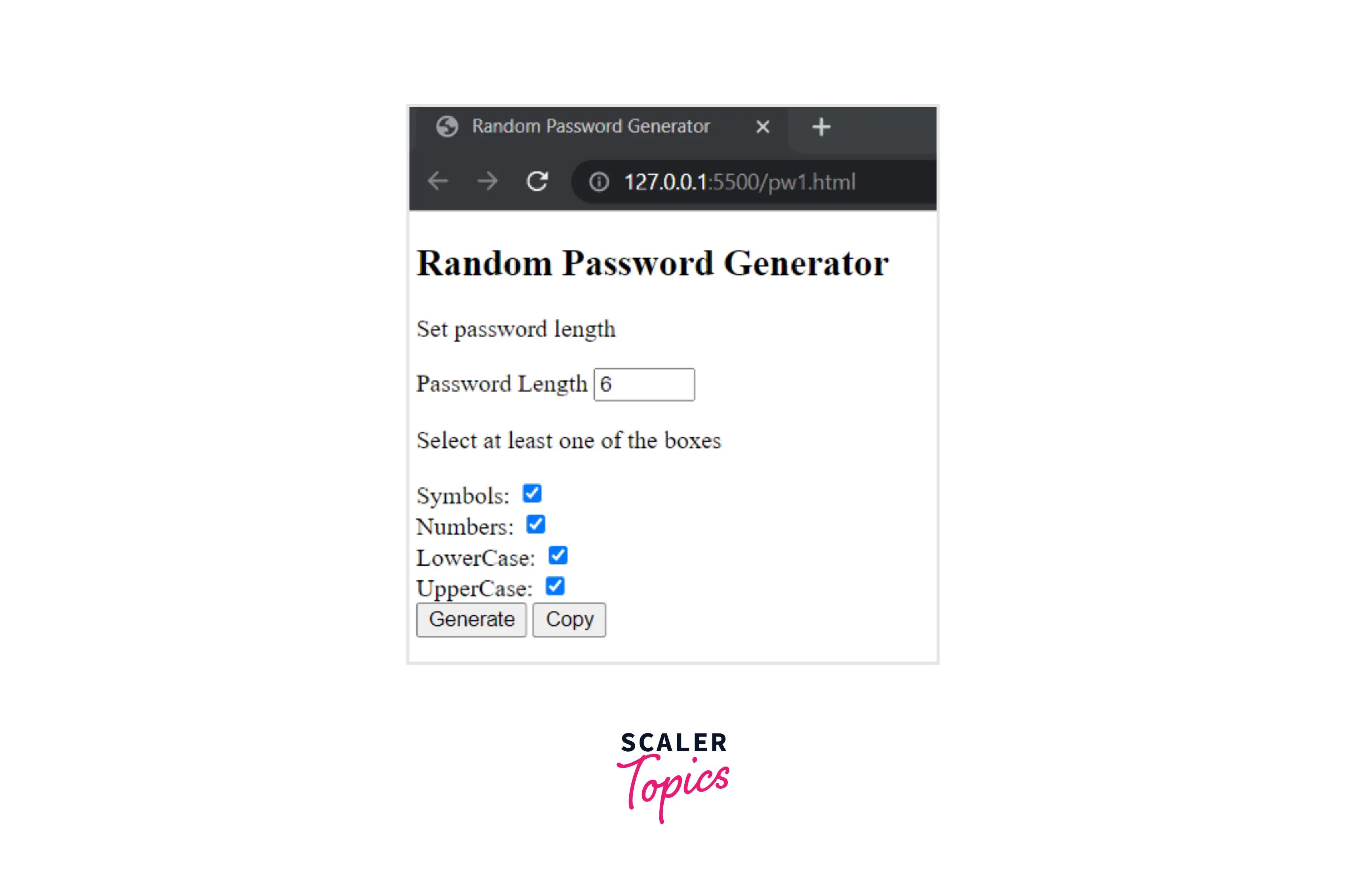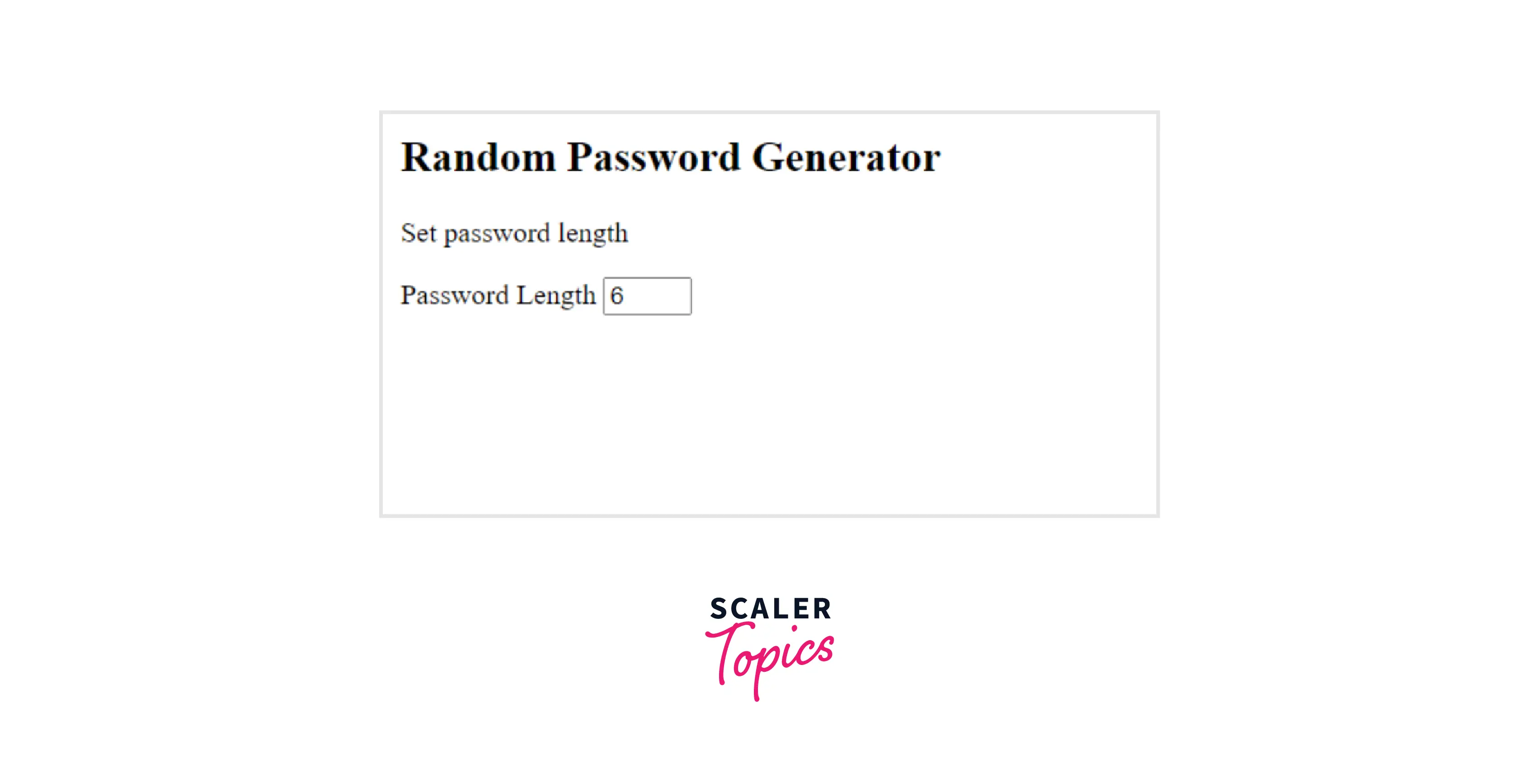 To begin with, there has to be a field to set the password length, for which, the <input type="number"> will be used. Also, the attributes, min and max will be used to define the lower and upper lengths for the password length. And for the default length, the value attribute will be used.