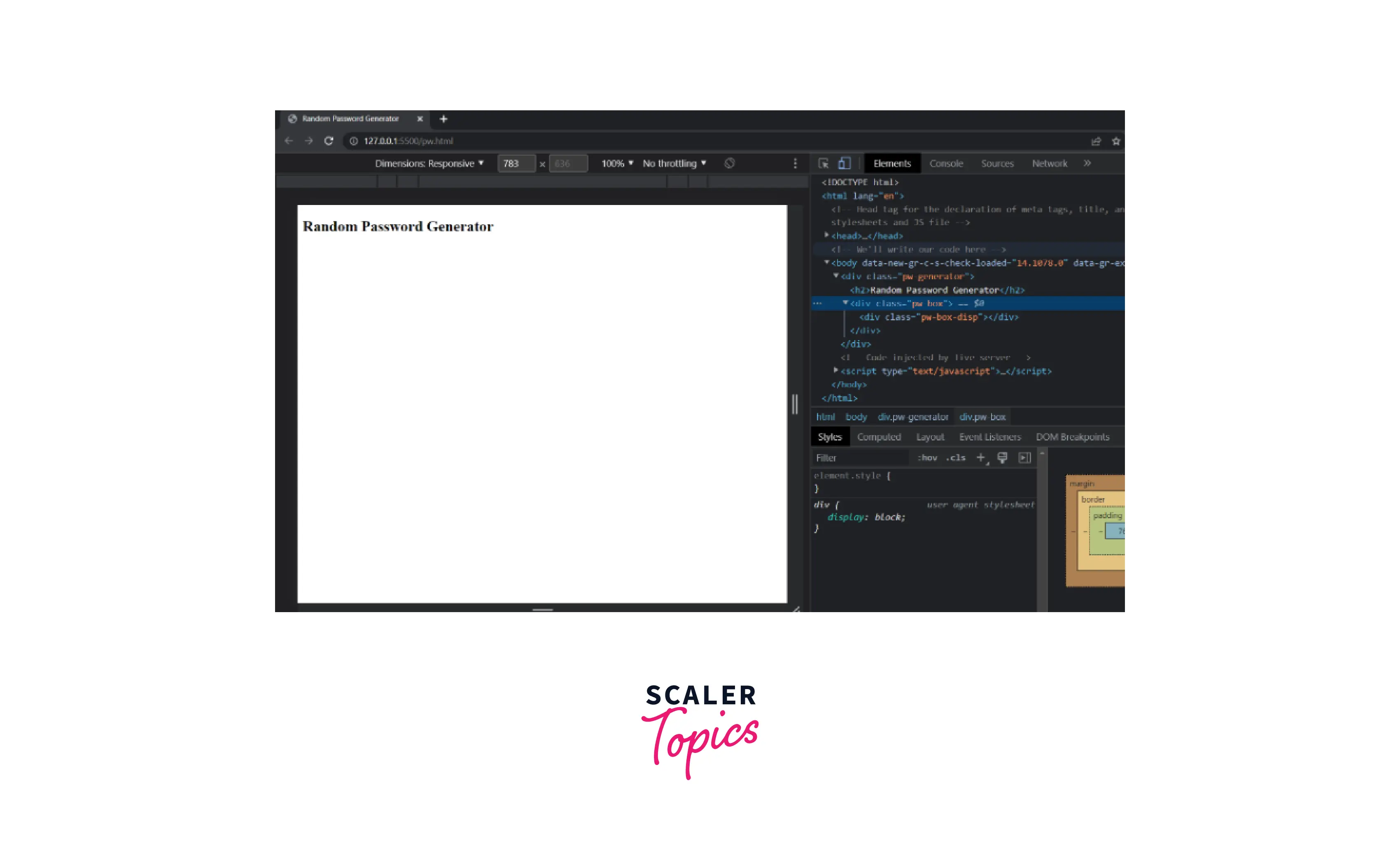 The first thing we'll do is create a div element that will serve as a container for all the components of a password generator. So, we can add a straightforward heading. After the heading, there is a password box, which is enclosed by another div element. When the user selects the generate button, the password will be shown inside the inner div element of the password box.
