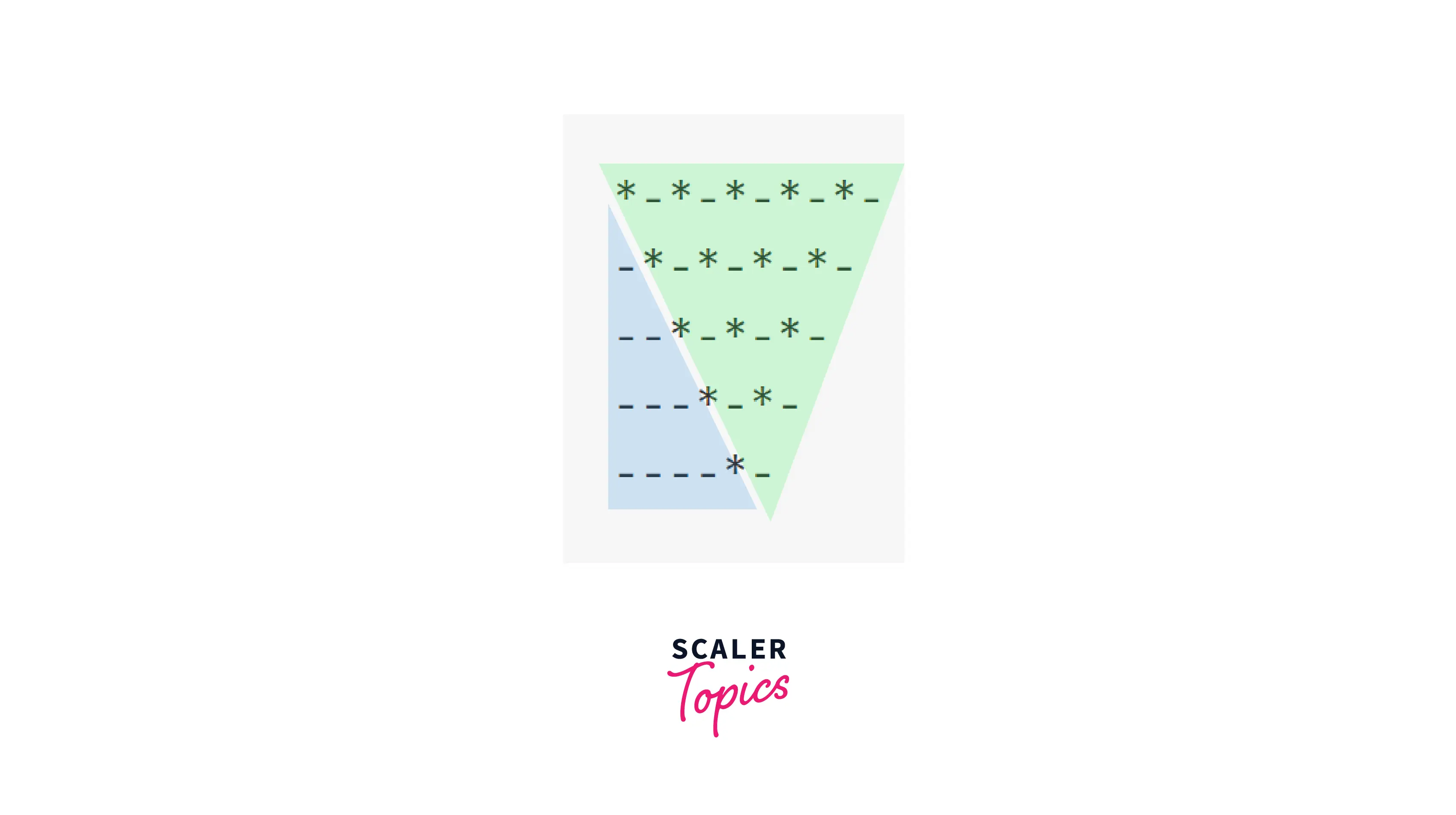 We want to print (n-i+1) stars in each row. So our outer loop will iterate ‘n’ times and the inner loop will iterate (n-i+1). Each row starts with a specific number of stars, and as the row number increases, the row starts with fewer stars, forming the inverted