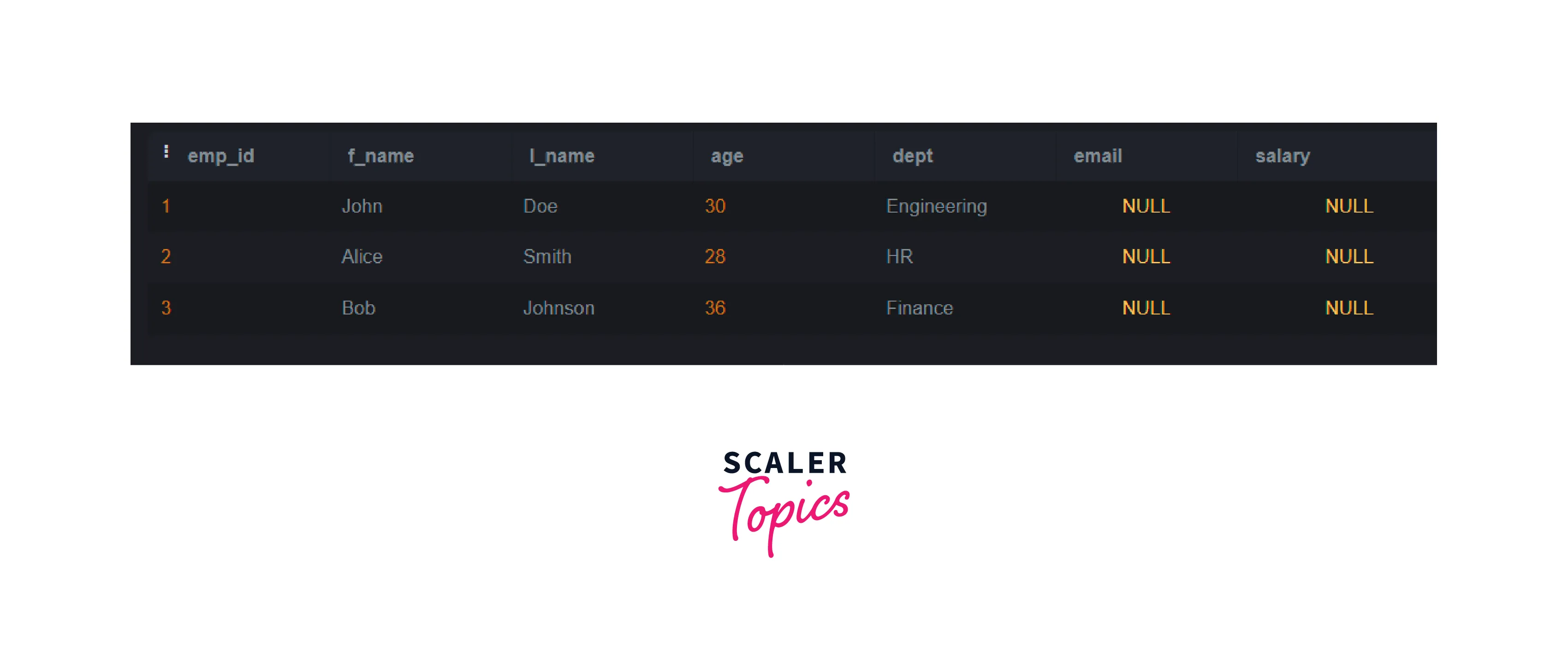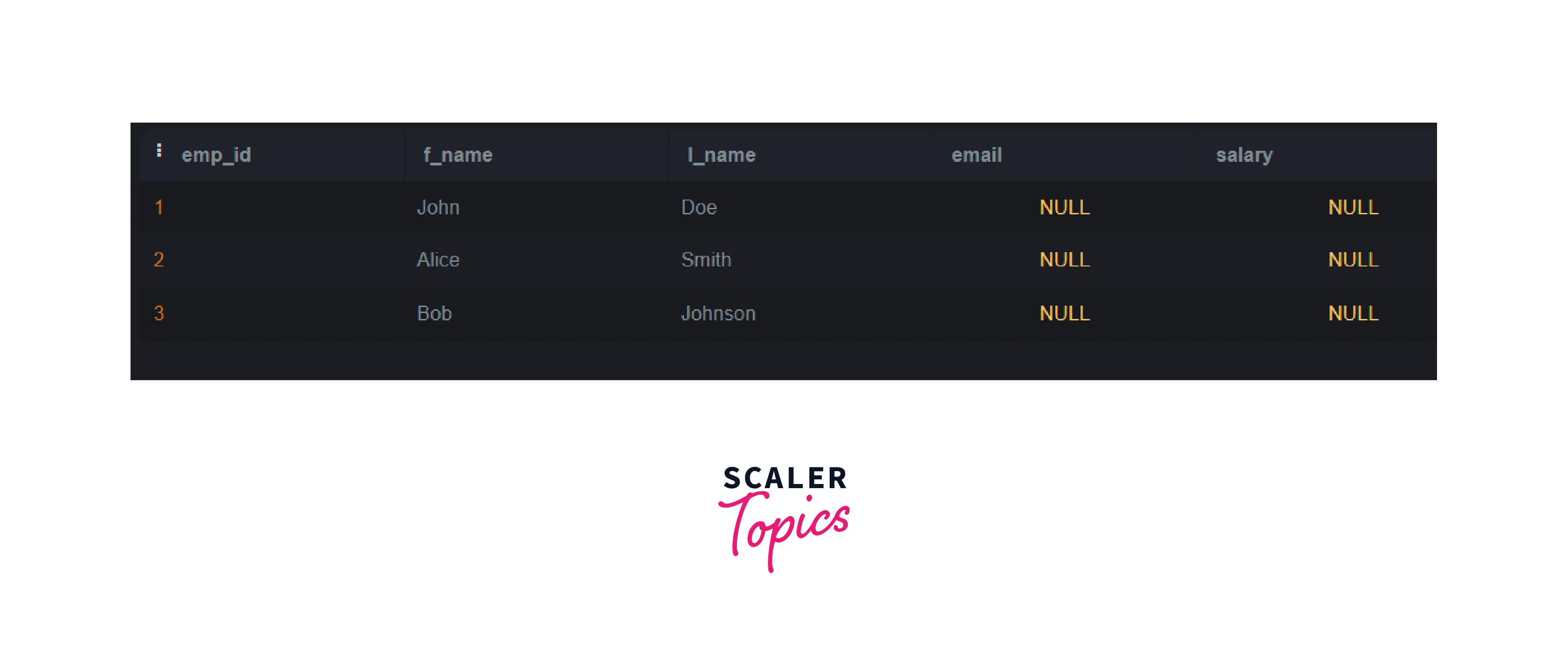 | ADD COLUMN | Adds a new column to the table. You need to specify the name of the new column and its data type. New rows will have the NULL value by default until you provide a default value. |
