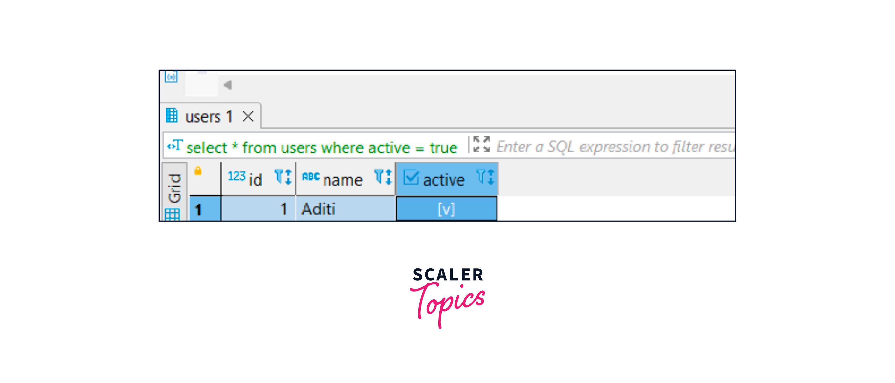 In this example, we are creating a table named users in a PostgreSQL database. The table has three columns: id, name, and active. The active column is of type BOOLEAN and has a default value of true.