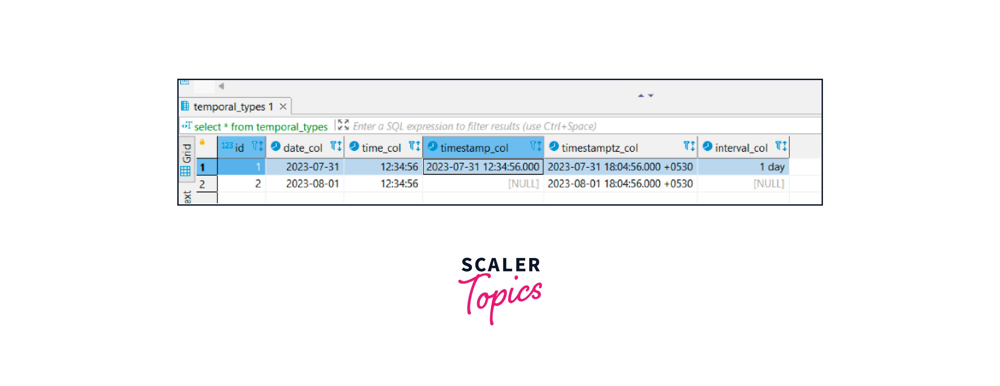 In this example, we are creating a table named temporal_types. This table consists of six columns with different temporal types: id, date_col, time_col, timestamp_col, timestamptz_col, and interval_col.